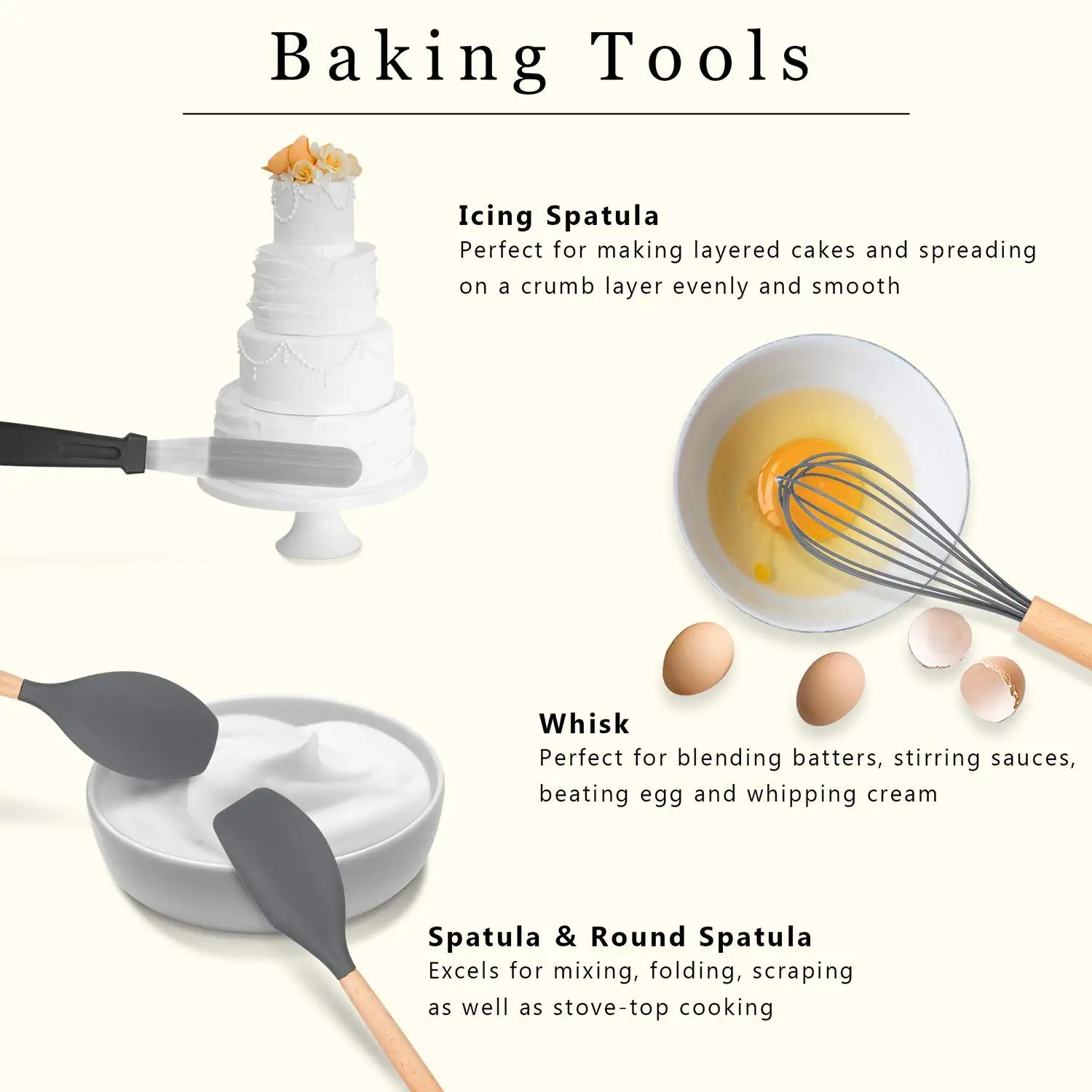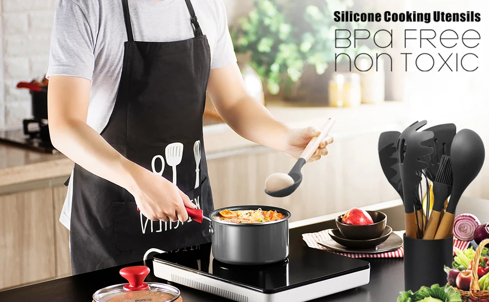 Наш набор кухонной утвари сконструирован из прочных высококачественных силиконовых насадок, которые надежно привязаны к ручкам из натуральной твердой древесины акации, чтобы поддерживать готовку годами. Наш нетоксичный, не содержит бисфенола А, одобренный FDA набор кухонной посуды всегда выглядит и ощущается так, как вы ожидаете.
