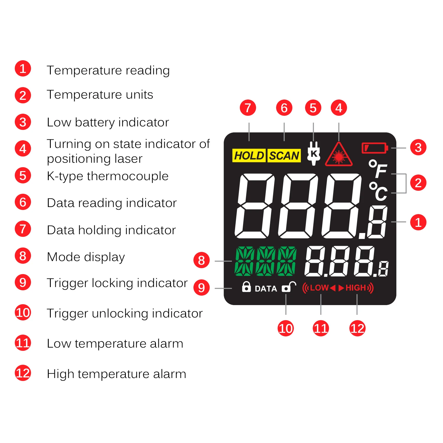 Дополнительные характеристики: Автоматическое отключение после 30 с без работы; Оповещение о высоких и низких температурах; Переключение по Цельсию (℃) и Фаренгейту (℉); Лазерное позиционирование; Определение местоположения горячей точки.