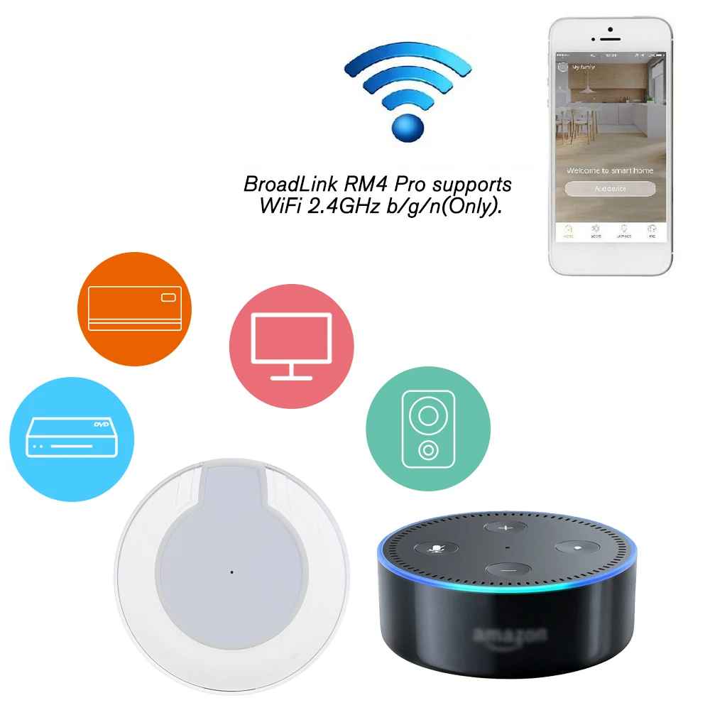 【Голосовое управлениеСовместим с Alexa/Echo, Google Home, IFTTT для голосового управления вашим телевизором, STB, кондиционером и вентиляторами. Устройство поддерживает только 2,4G WiFi.
