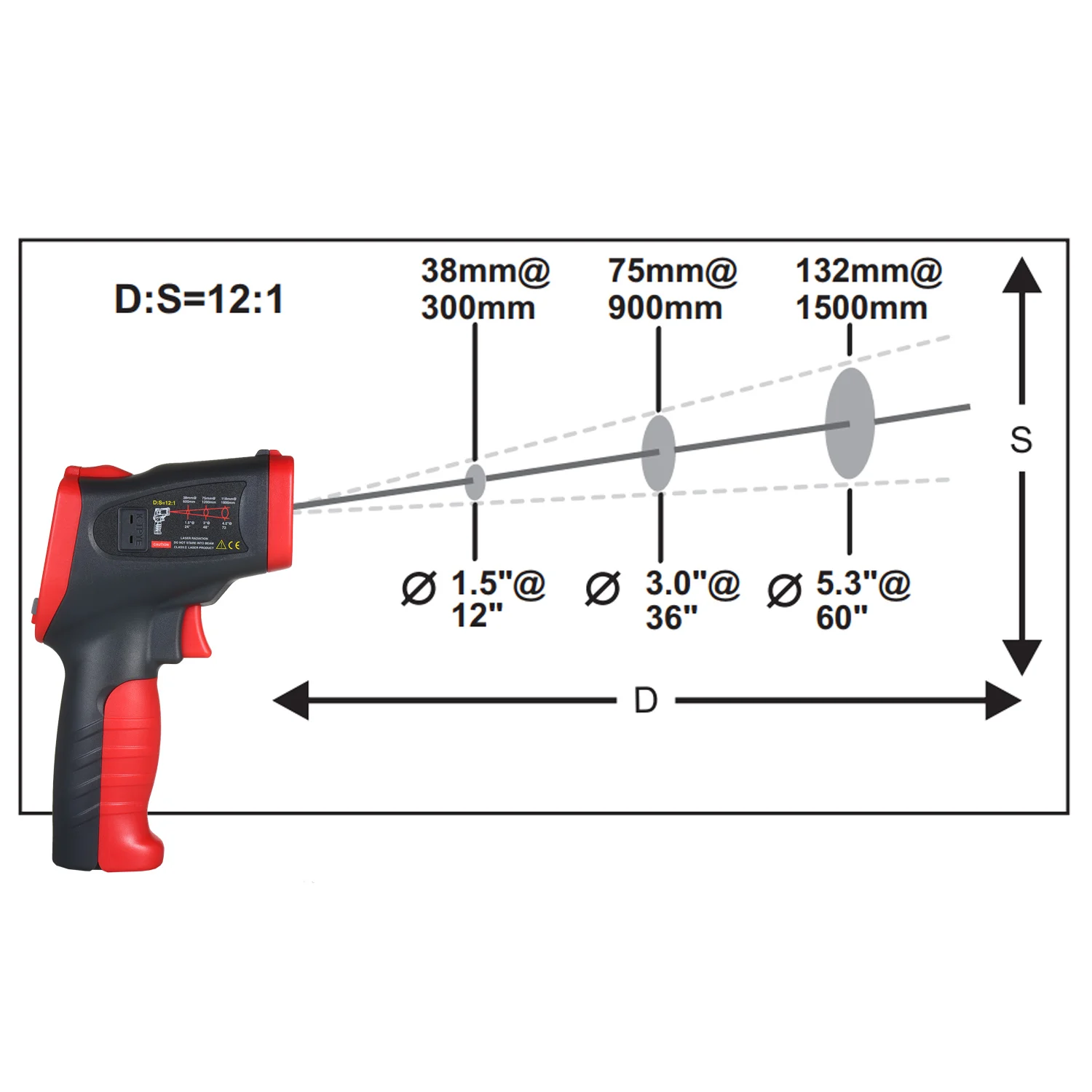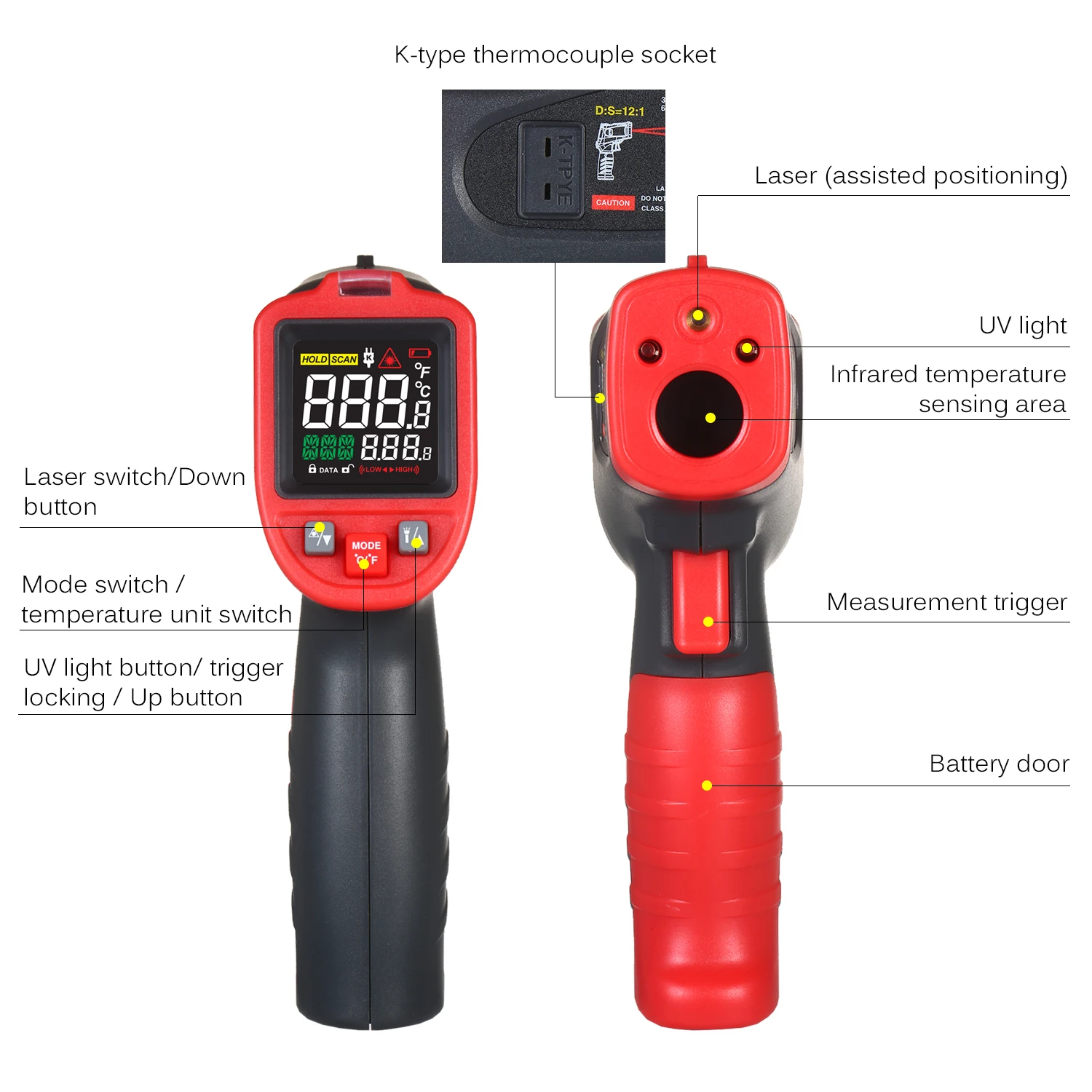 Дополнительные характеристики: Автоматическое отключение после 30 с без работы; Оповещение о высоких и низких температурах; Переключение по Цельсию (℃) и Фаренгейту (℉); Лазерное позиционирование; Определение местоположения горячей точки.