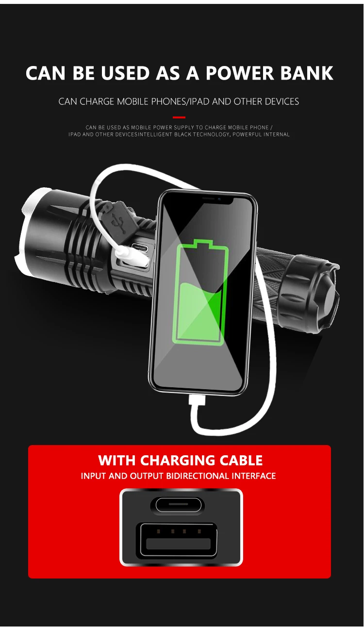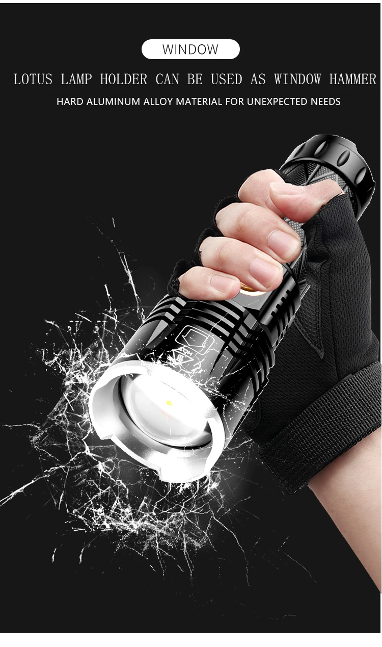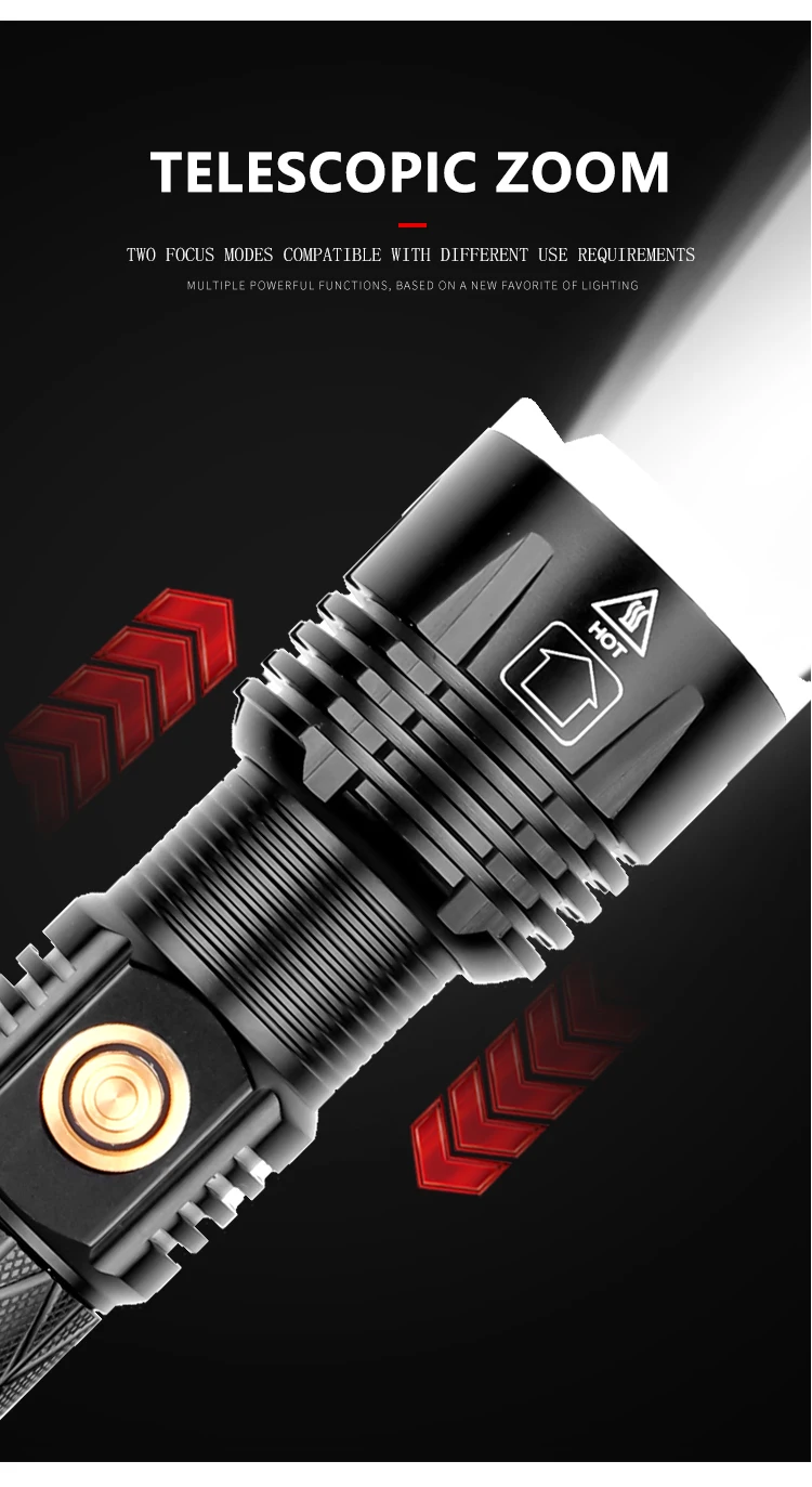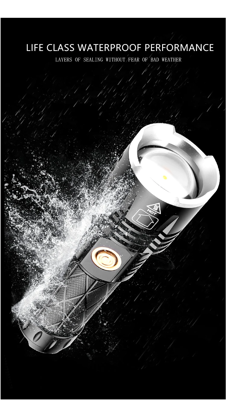 Концепция дизайна: Мощный светодиодный фонарик Увеличьте 1*18650 или 1*26650 аккумуляторный отсек, чтобы увеличить время работы. Дисплей емкости аккумулятора, телескопический зум Микро-usb для компьютера usb, Автомобильный USB, usb-разъем для зарядки, зарядный фонарик Изготовлен из авиационного алюминиевого сплава прочный HAIII военный класс Жесткий анодированный Водонепроницаемый в соответствии с IPX-6, водостойкий, может использоваться в дождливую погоду, но не может положить его в воду Подходит для работы, охоты, альпинизма, рыбалки, кемпинга и активного отдыха и т. д. Ударопрочный до 2 метров.