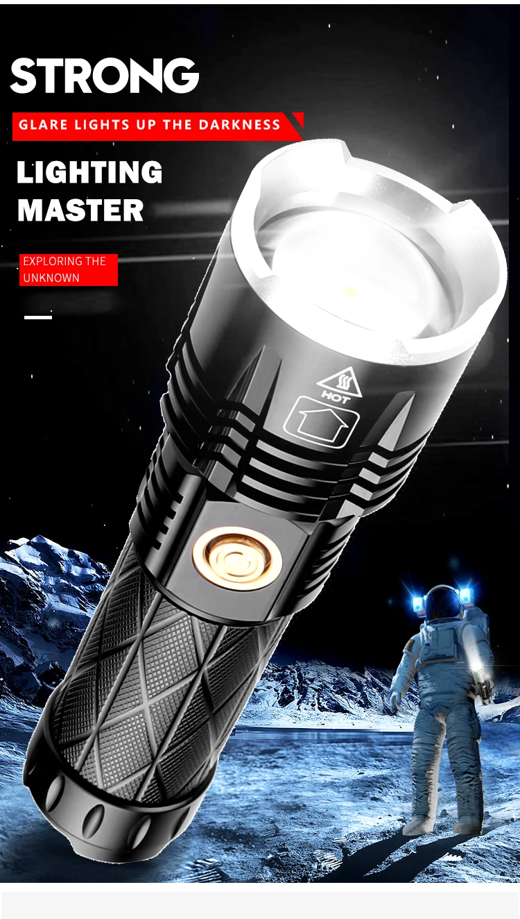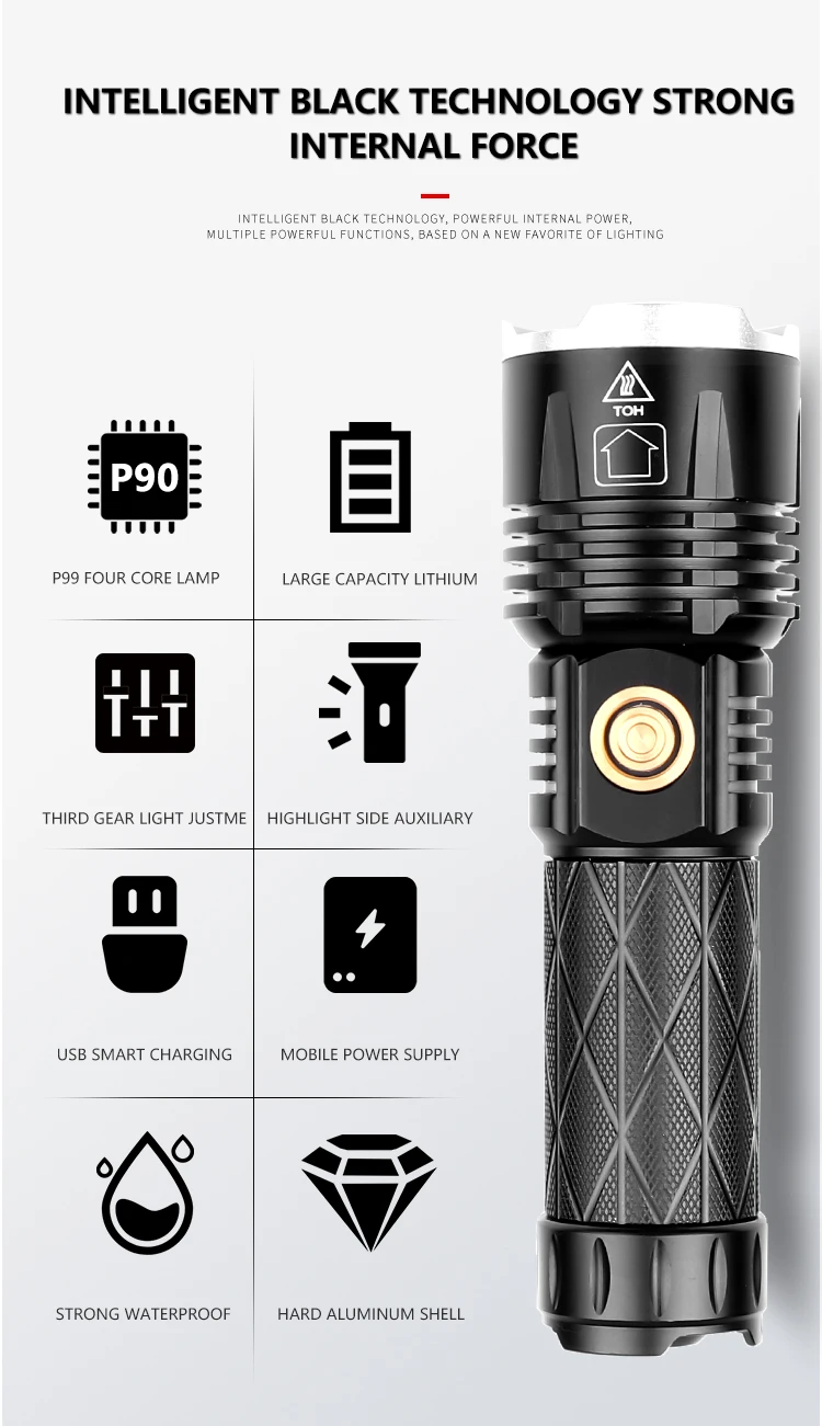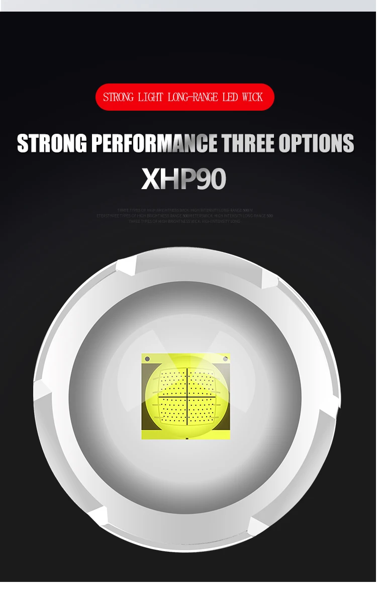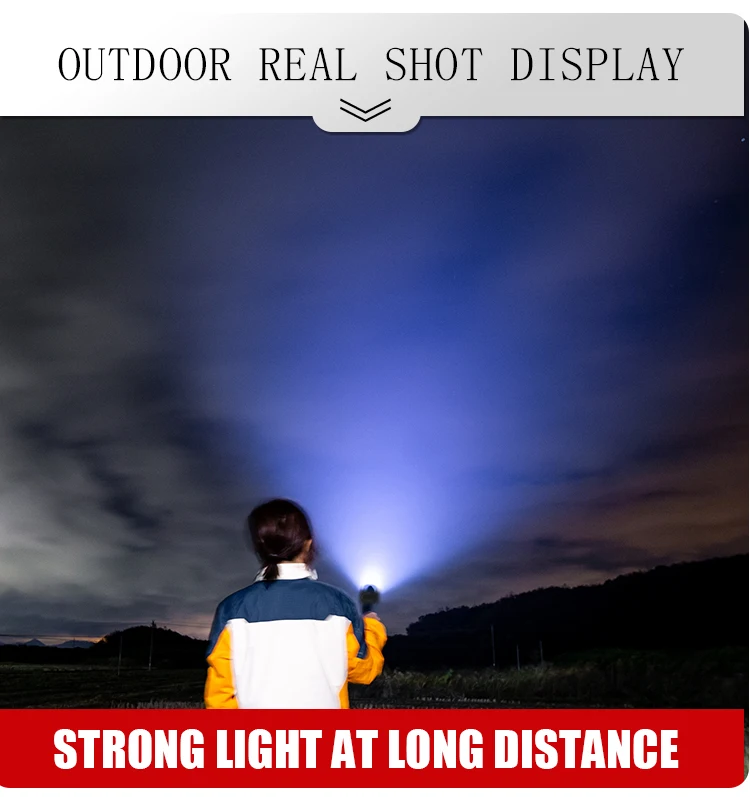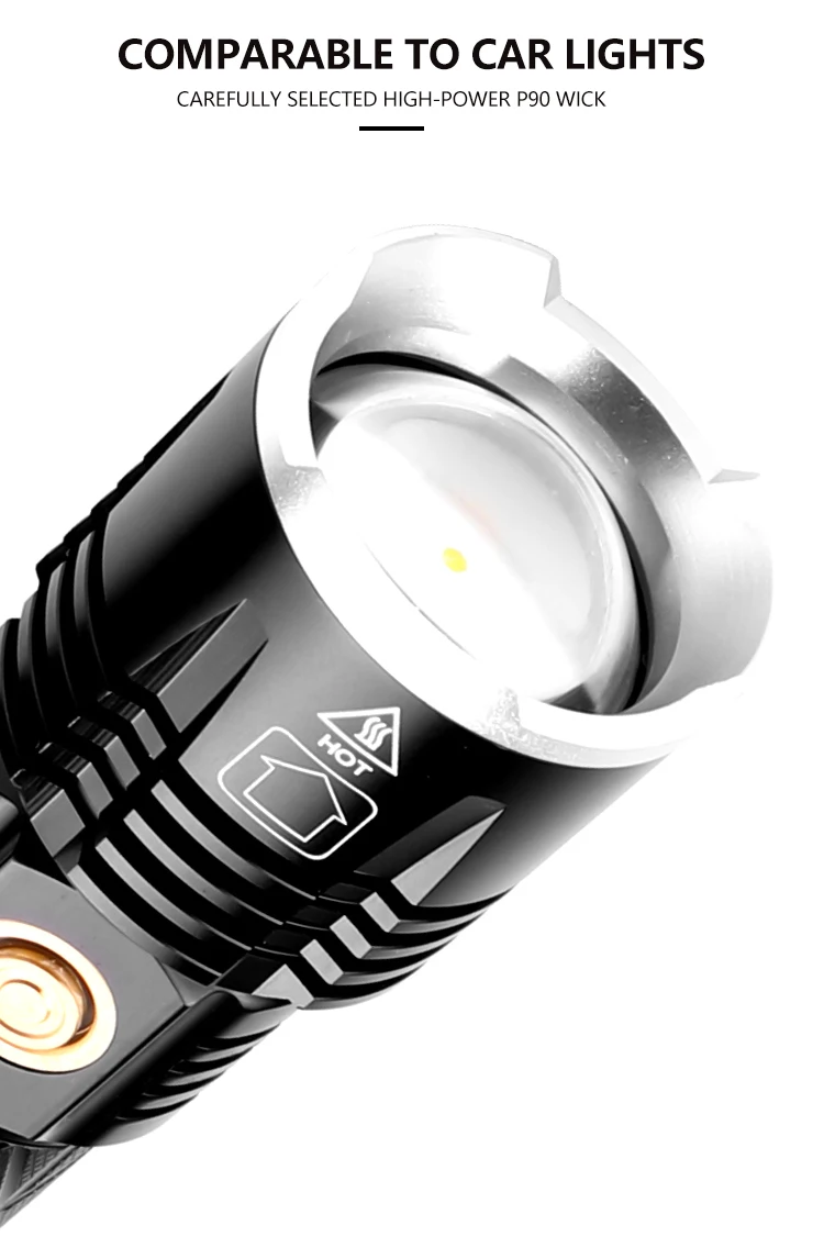 Концепция дизайна: Мощный светодиодный фонарик Увеличьте 1*18650 или 1*26650 аккумуляторный отсек, чтобы увеличить время работы. Дисплей емкости аккумулятора, телескопический зум Микро-usb для компьютера usb, Автомобильный USB, usb-разъем для зарядки, зарядный фонарик Изготовлен из авиационного алюминиевого сплава прочный HAIII военный класс Жесткий анодированный Водонепроницаемый в соответствии с IPX-6, водостойкий, может использоваться в дождливую погоду, но не может положить его в воду Подходит для работы, охоты, альпинизма, рыбалки, кемпинга и активного отдыха и т. д. Ударопрочный до 2 метров.