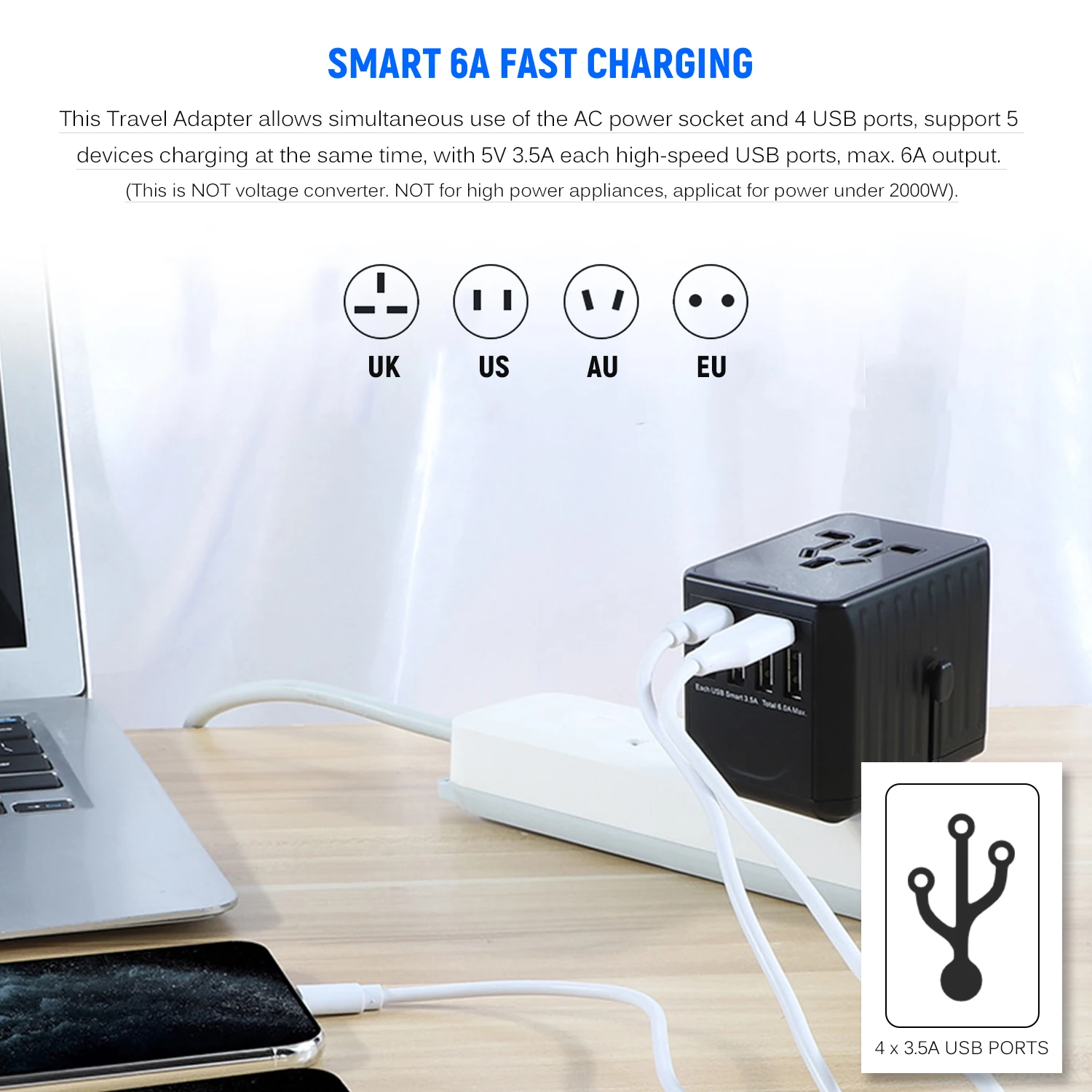 Смарт-6A быстрой зарядки--- Этот дорожный адаптер позволяет одновременно использовать разъем питания переменного тока и 4 usb-порта, поддерживает одновременную зарядку 5 устройств, с 5 В 3,5a всеми высокоскоростными usb-портами, Макс. 6A выход. (Это не преобразователь напряжения. Не для высокомощных приборов, аппликатор для мощности до 2000 Вт).