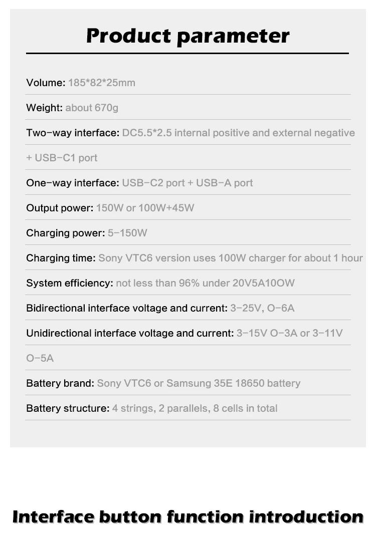 ② Мощный DC150W зарядный вход, ультра-быстрая скорость зарядки, это занимает всего 60 минут, чтобы полностью зарядить Sony C6 версии 96W, И всего 80 минут для полной зарядки ВЕРСИИ Samsung 35E. 96 Вт самозарядка в течение 11 минут или 150 Вт самозарядка в течение 7 минут, вы можете зарядить общую емкость 4500 мАч мобильный телефон. Вход поддерживает постоянный ток CC, постоянное напряжение CV, режим отключения V-OFF низкого напряжения, поддерживает зарядку 5-150 Вт постоянного тока, поддерживает PD или QC зарядку, автоматически определяет зарядную мощность, может также использоваться в качестве электронной нагрузки, поддерживает солнечное MPPT автоматическое отслеживание мощности.