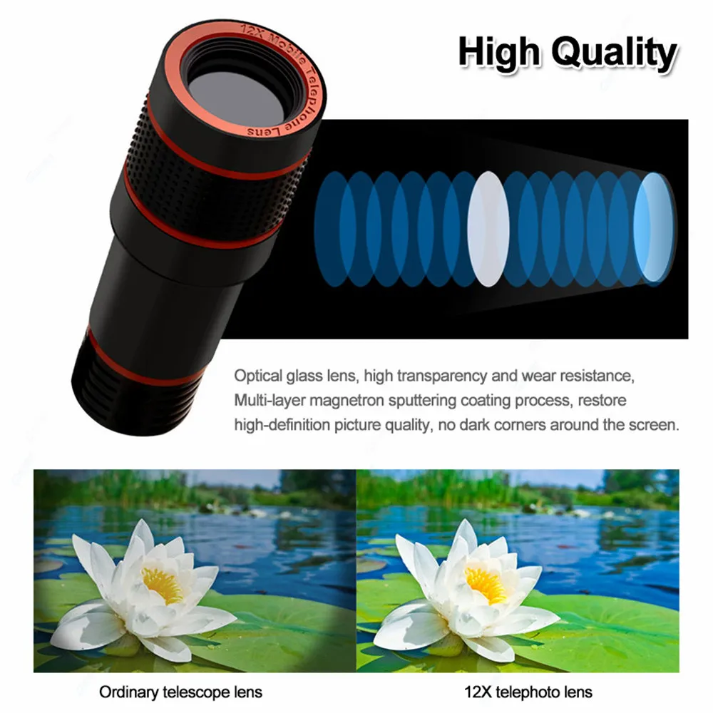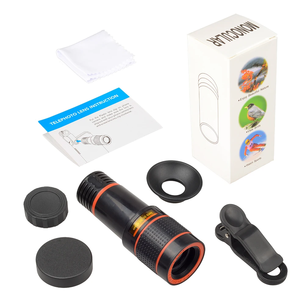Особенности: * Телескопа 12 кратное увеличение, с помощью которой можно регулировать фокусное расстояние хорошо. * Телескоп можно использовать как монокуляр. * Подходит для большинства мобильных телефонов, включая флип-телефоны и бар-телефоны, телефон имеет заднюю камеру, может быть подключен к телескопу через зажим. * 360 градусов Нет черного угла, захватывайте более четкое изображение для вас. Мобильный телефон качество изображения может быть улучшено, очевидно. * Подходит для просмотра игры, концертов, туризма, наблюдения за животными, съемки на дальние расстояния и т. Д. * Частный детектив фотографирует экспертизу, геологоразведку, управление лесным хозяйством, планирование железнодорожных портов и т. Д. Параметры: Тип: телефонный телескоп (гибкий) Материал: оптические линзы, ABS Размеры: 3,5*8,5 см/1,4*3,3 "(Д * В) Чистая Вес: 70 г/2,5 унций Фактическое увеличение: 12X Диаметр объектива: 25 мм Расстояние выходного зрачка: 2,2 мм Диаметр выходного зрачка: 11 мм Поле зрения: 70 градусов Держатель для камеры/сотового телефона -Этот уникальный адаптер/держатель добавляет винтовое отверстие на мобильный телефон. -Позволяет прикрепить телефон к моноподу или штативу для лучшего качества изображения. -Он поддерживает мобильный телефон с шириной от 2,17 "(5,5 см) ~ 3,35" (8,5 см) Например: для iphone 5/5S/6/6 Plus/7/7 PLUS для GALAXY S7/S7 edge/S7 edge plus/S6/S6 edge/Для GALAXY Note2/Note3/Note4. .... Большинство смартфонов Посылка включает в себя: 1 X 12X Мобильный телеобъектив (с оригинальной упаковкой) 1 x зажим Салфетка для протирки (1 шт.) Розничная коробка-1 шт. Обратите внимание: 1. Пожалуйста, используйте его осторожно, потому что линзы отрегулированы точно, если он падает или ударяется, поле зрения может не совпадать и изображение будет отклоняться, 2. Пожалуйста, не погружайтесь в воду. Если он попадет в воду, пожалуйста, восстановите его быстро. 3. Пожалуйста, не смотрите на солнце абсолютно, ваши глаза могут иногда болеть и слепить.