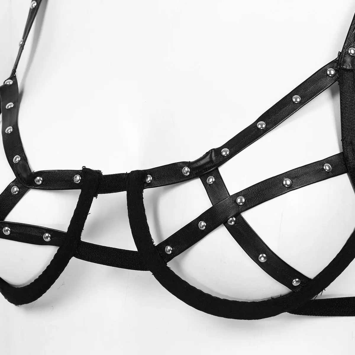 Эластичные бретельки-спагетти, кожаные ремни, получашки с заклепками, дизайн на косточках для хорошей поддержки.