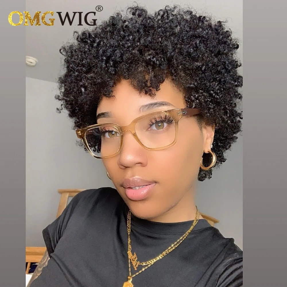 Короткие прямые вьющиеся человеческие волосы с челкой афро, привлекательный локон парик с детскими волосами prepucked бразильские волосы Remy парик для женщин
