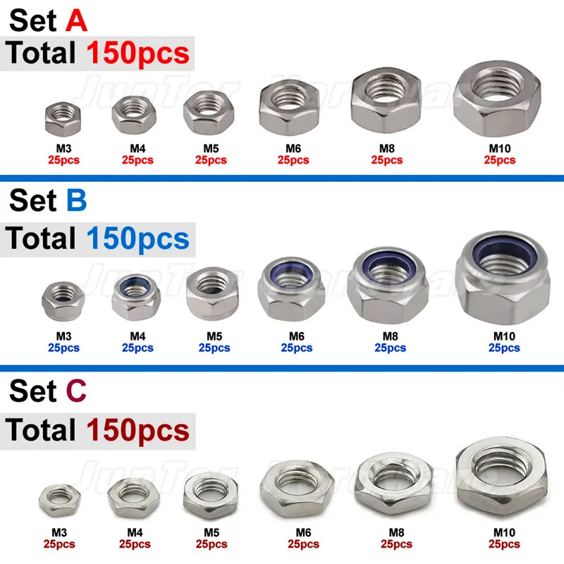 Это для одного мешка из 150 штук M3 M4 M5 M6 M8 M10 A2, шестигранные гайки из нержавеющей стали, нейлоновые гайки для блокировки, шестигранные тонкие гайки в ассортименте.