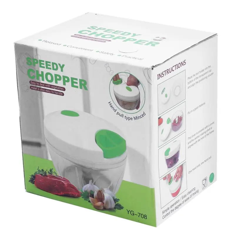 This speedy manual food chopper will help you cut vegetables, fruits and nuts. Putting the food into the bowl and pulling the rope once can chop food 15 times. Even the onion will not make your eyes watery. You can also make dips and chutneys in it .This chopper not only chops vegetables and fruits, but also can be as mincer and grinder to mince boneless meats and cottage cheese.