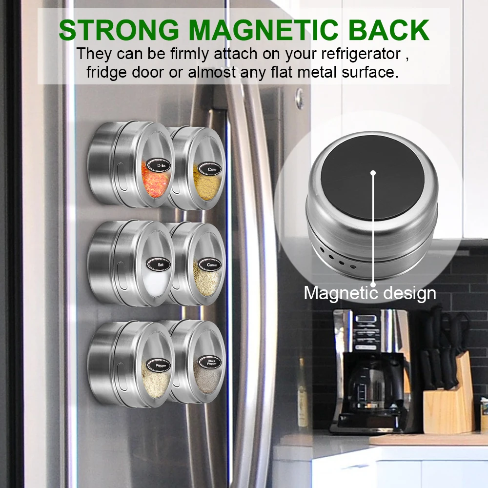 Хорошие магнитные свойства-контейнеры для хранения олова для специй, включая магнитные днища, резервуары для хранения имеют магнитный держатель, прилипают к любой плоской металлической поверхности, что позволяет легко организовать другие предметы.