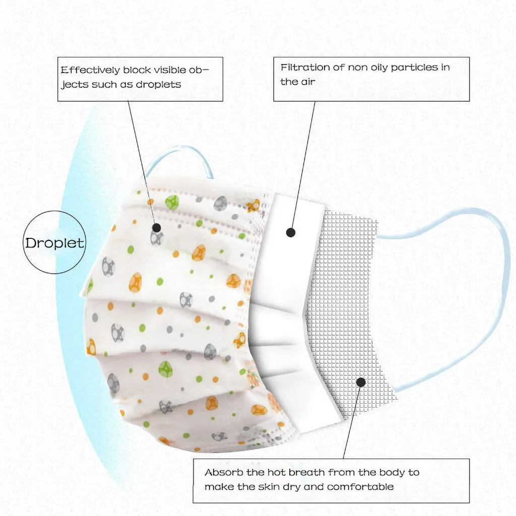 В 3 слоя Нетканая одноразовая маска изготовлена из 3 слоев нетканого материала, Безопасен для здоровья и использования. Дышащий материал и милый Узоры, что делает его полезным и модным. Специальный 3 слоя из нетканого материала Дизайн, обеспечивает некоторые защиты от пыли, выхлопных газов автомобилей, Пыльца и т. д. эластичная петля для ушей, легко носить и не давить на уши. Маникюрный салон или любые другие зоны, где может потребоваться защита