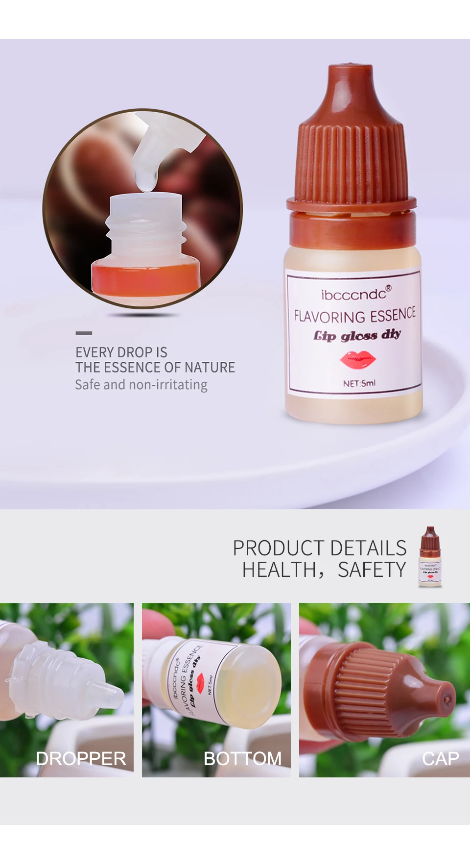 Емкость: 5 мл Количество: 6 шт./комплект Срок годности: 3 года Вкус: лаванда, клубника, роза, жасмин, шоколад, оранжевый Особенности: 1. Изготовлен из натуральных и нетоксичных растений. 2. Пищевой материал, безопасно для ребенка и взрослых. 3. Отличный аксессуар для косметики diy, как блеск для губ, помада и т. д. 4. Хороший запах, вы будете чувствовать себя комфортно весь день.