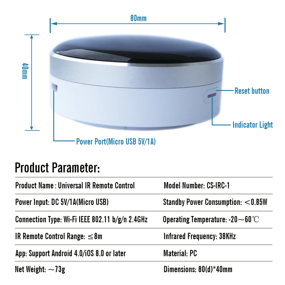 * Название продукта: Универсальный ИК-пульт дистанционного управления * Номер модели: CS-IRC-1 * Вход: 5 В/1 а постоянного тока (Micro USB) * Потребляемая мощность в режиме ожидания: <0,85 Вт * Инфракрасная частота: 38 кГц * ИК-пульт дистанционного управления: ≤ 8 м * Подключение: Wi-Fi IEEE 802,11 b/g/n 2,4 ГГц * Приложение: Поддержка Android 4,0/iOS 8,0 или более поздней версии * Рабочая температура: -20 ~ 60 ℃ * Вес нетто: около 73 г * Материал: Поликарбонат * Размеры: 80*80*40 мм