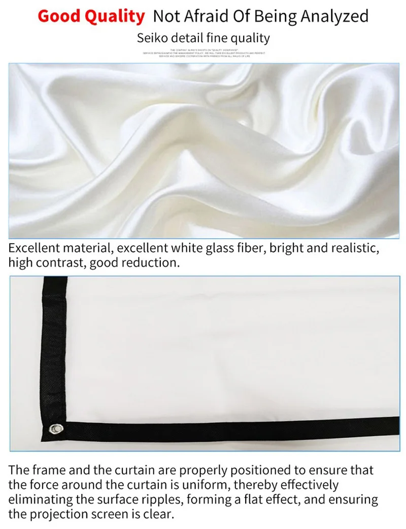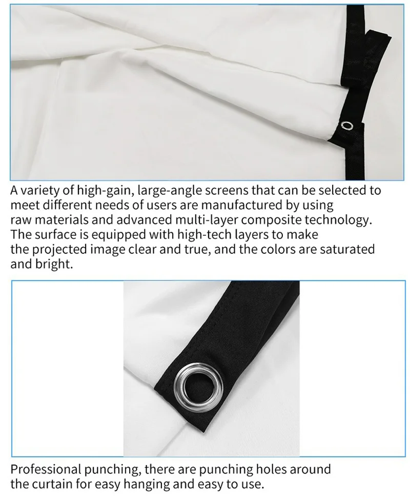 “Wrinkles, Please Go Away!” You don’t need to worry about wrinkles or creases caused by screen folding. Just hang it indoors or outdoors, invite your families or your friends, sharing your joyful time with each other.projector movie screen is brighter than most other projection screens, smooth surface enhance image results. We hope that our high contrast screen and anti-crease material will make everything easier. If there’s dust on it , clean it with wet cloth is recomme