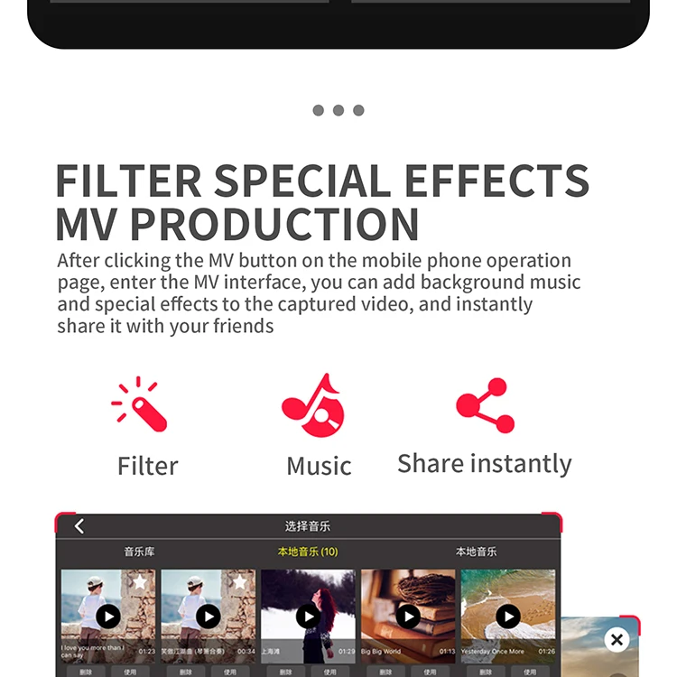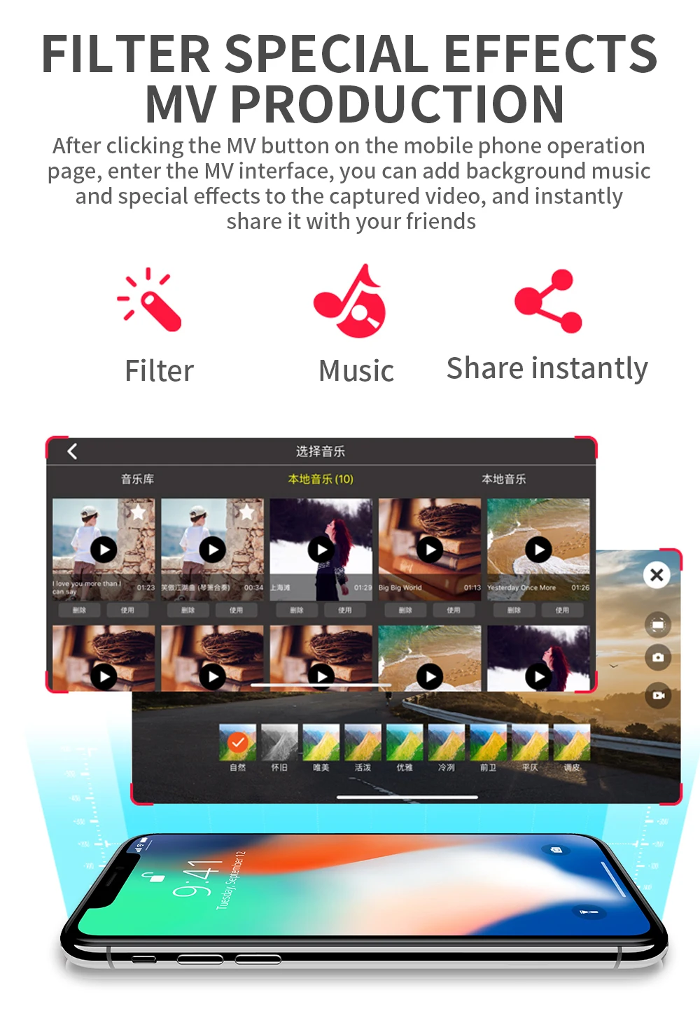 -MV functions: filters, video effects, add background music, picture / video sharing
