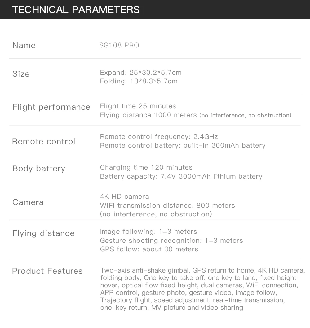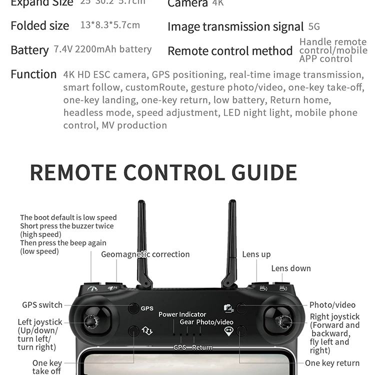 Two-axis anti-shake gimbal,GPS return to home,4K HD camera,folding body, One key to take off, one key to land,fixed heighthover, optical flow fixed height,dual cameras, WiFi connection,APP control, gesture photo, gesture video, image follow,
