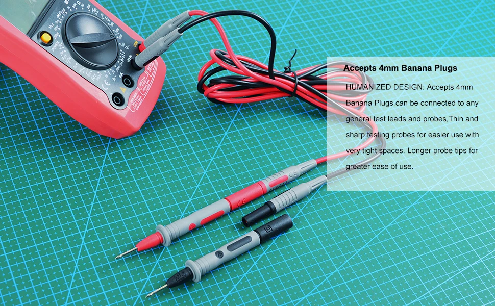 ►HUMANIZED дизайн: принимает 4 мм банановые пробки, может быть подключен к любым общим тестовым проводам и зондам, тонкие и острые испытательные зонды для более легкого использования с очень плотными пространствами. Более длинные наконечники зонда для большей простоты использования. Упаковано в практичный 3-купе чехол для того, чтобы помочь сохранить этот важный аксессуар в целости и сохранности