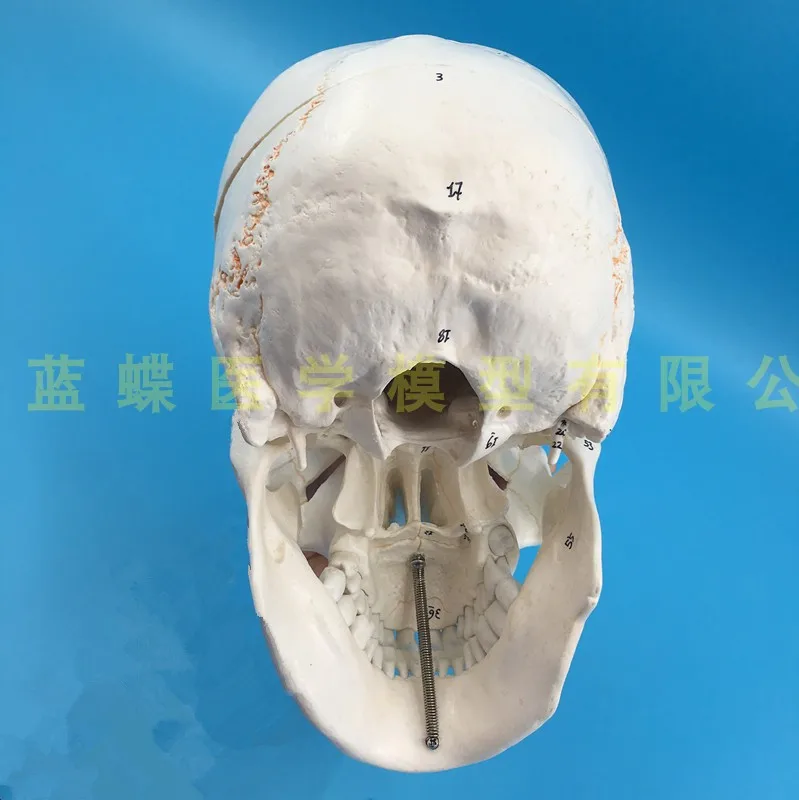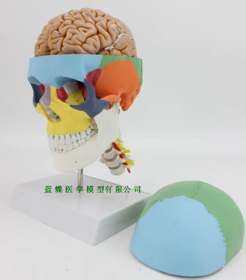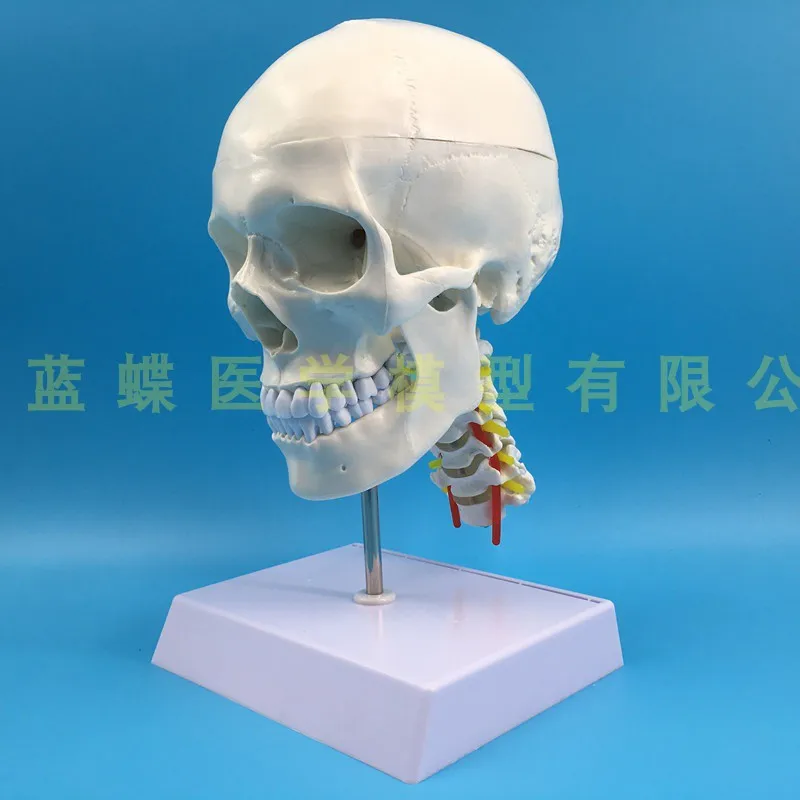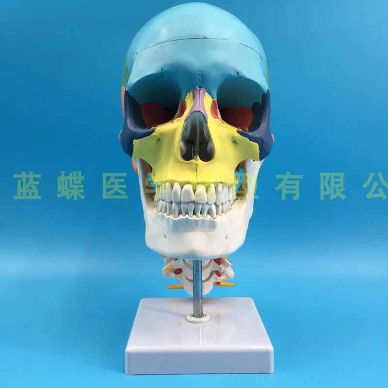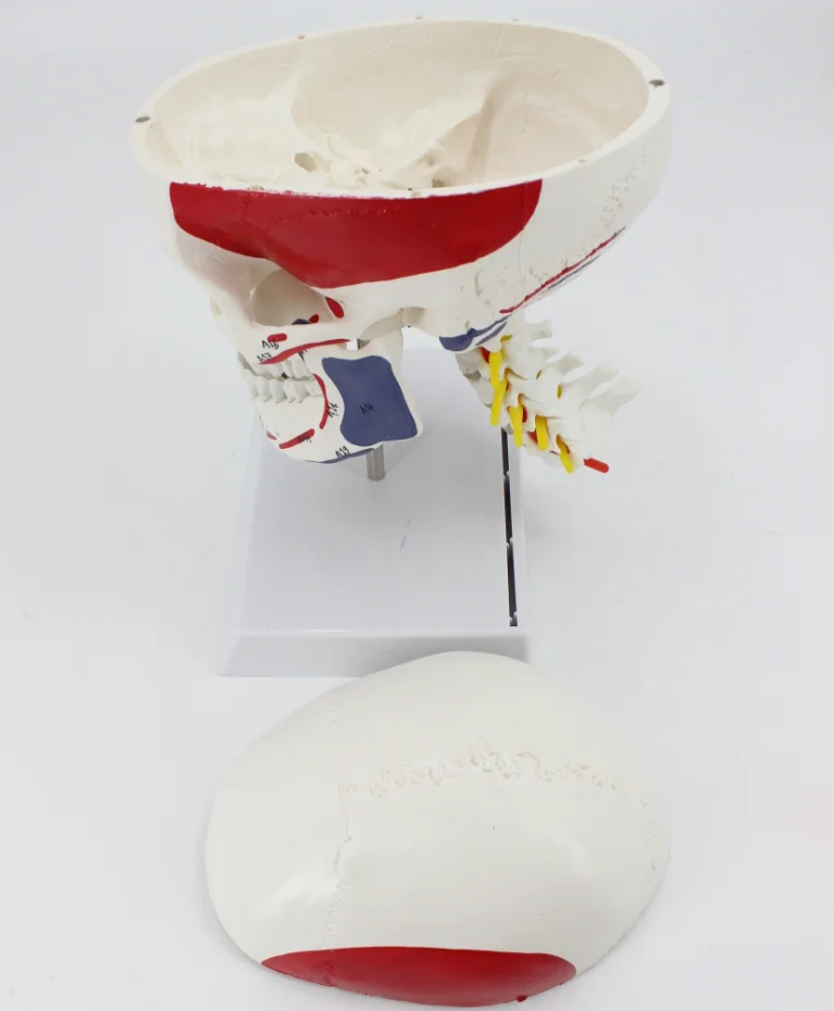 功能特点:本模型由头骨和 7 节颈椎组成,带颈椎动脉,活动下巴.可打开的头盖骨和可拆卸的下巴并标注肌肉着色编码,有底座.