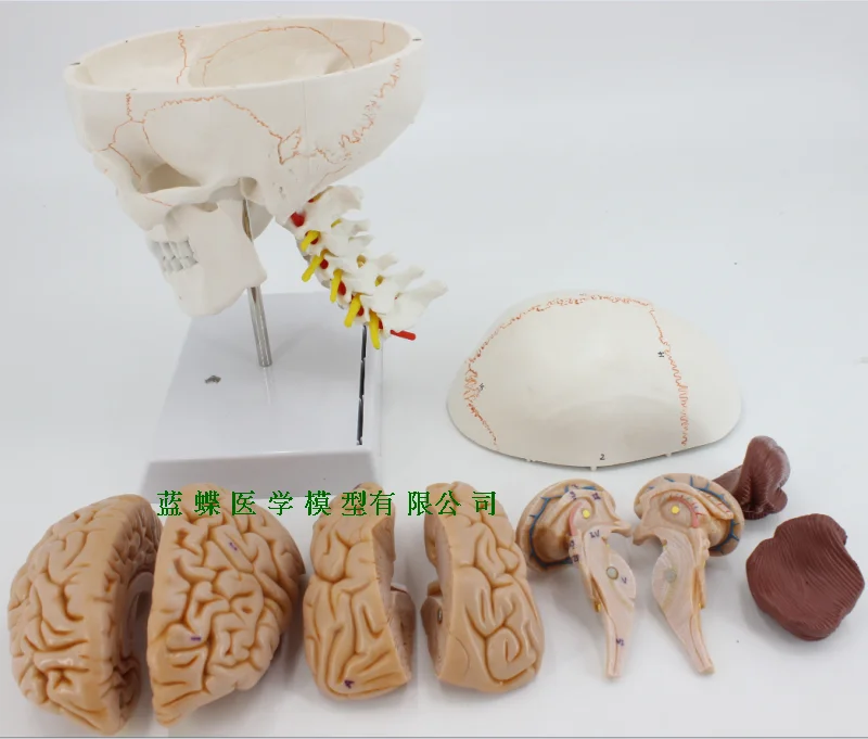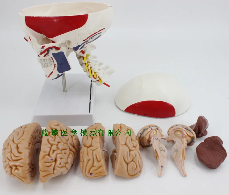 本模型由人体 1:1头骨和 7 节颈椎及脑组成,带肌肉起止点着色显示,带颈椎动脉,有底座.模型带大脑解剖结构,带数字标示,颅模型可以从灵活安装的颈椎上随意拆装.同时也显示了后脑,脊髓,颈神经,椎动脉,基底动脉和后脑动脉