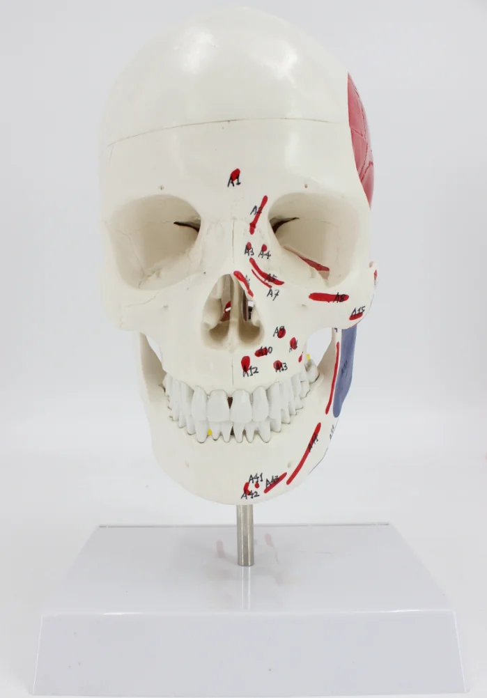 功能特点:本模型采用环保pvc材料做成, 使用真人头骨开模,高仿人体头骨骨骼结构,展示颅骨形态毗邻和颅底的内外面观及肌肉.是神经外科,骨科,美术等示教模型.带 48 个数字标识,配对应中英文说明书卡片,尺寸:19x18x23cmA153肌肉着色头骨模型,3部件(数字标识)