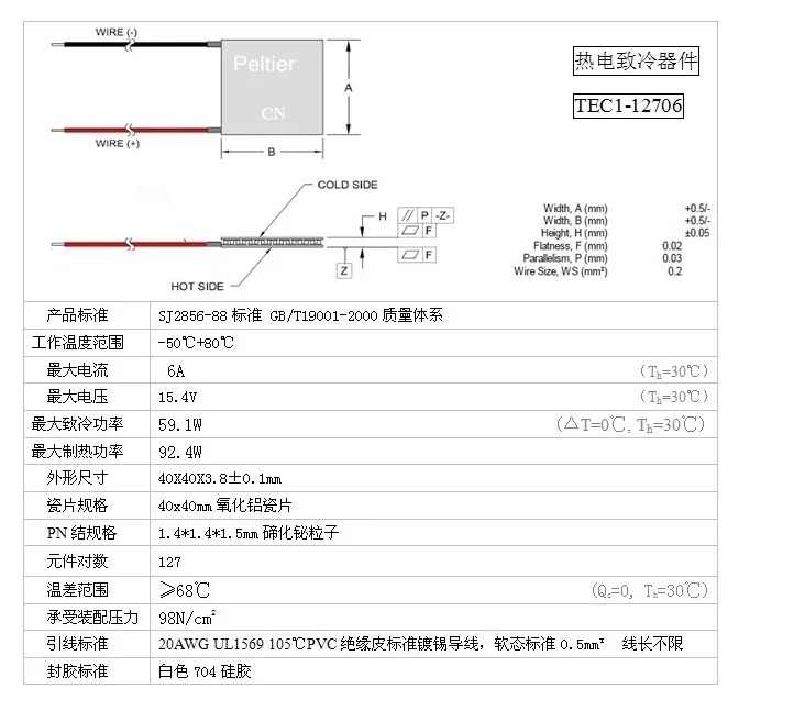 TEC1-12710 40 * 40 Chip: TEC1-12710 Dimensions: 40 * 40 127 * 3.4mm logarithmic components Cable Specifications: 300 +/- 5mm long, single head RV lead wire, 5mm tin plated Internal resistance value: 1.2 ~ 1.5 Ω (23 +/- 1 degree, ambient temperature 1KHZ Ac test) Maximum temperature difference: delta Tmax (Qc = 0) above 60 degrees. Operating current: Imax = 10 at voltage (vmax 15 start) Rated voltage: DC12V (Vmax: 15.5V) Cooling power: 92w Qcmax Mounting pressure: 85 n / cm2 Operating conditions: Temperature range and 55 degrees ~ 83 degrees (high ambient temperature will directly affect the cooling efficiency) Encapsulation process: standard around 704 silicone rubber seal Packing: bubble box packing, storage conditions -10 degrees to 40 degrees ambient temperature Storage conditions: - 40 ~ 60 degrees TEC1-12712 40 * 40 Type: TECI-12712 Couples: 127 Imax (a): 12 Umax (V): 15.4 Qcmax (w) T = 0: 109 Tmax (°) Qc = 0: 68 Size: 40 * 40 * 3.4mm TEC1-12715 40 * 40 Model: TEC1-12715 Size: 40mm x 40mm x 4mm Operates from 0 ~ 15.4V DC and 0 ~ 15A Operating temperature: -40 to 90 Maximum power consumption: 165 watts