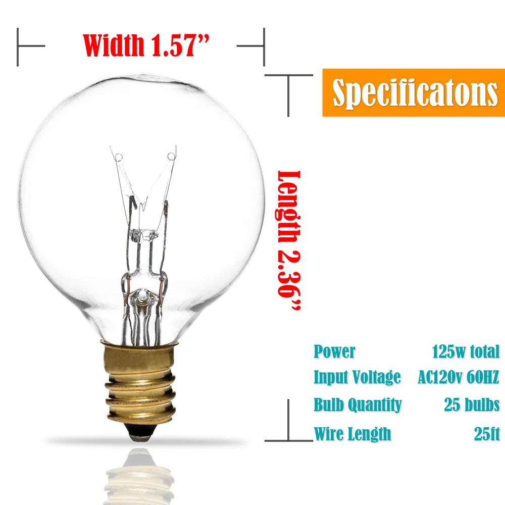 * 1,5 "Круглые лампы. 25 ламп в упаковке. * Подходит для розетки: C7 / E12 * 0,6 Вт для лампы, эквивалентно 5 Вт традициях старого лампы * Светильник Тип источника: вольфрамовый светильник * Напряжение: 120 в * Мощность: 5 Вт * Люмены L: 50 лм * Цветовая температура: 2300K-2700K * Степень защиты от пыли: IP44 * Материал корпуса: поликарбонат