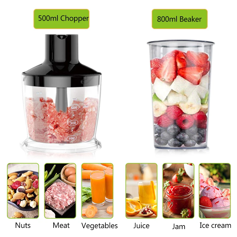 Особенности: -[Инструменты для нового образа жизни]: Если вы ищете способ сделать приготовление пищи проще, умнее и интуитивнее, ну, вы только что нашли это! Этот ручной блендер идеально подходит для приготовления соуса, овощных и фруктовых смузи, сальсы, протеиновых коктейлей, супа и детских пищевых продуктов или даже для смешивания теста и блинов. С его 4-в-1, подходящая ко всему, блендер обязательно станет вашим новым любимым кухонный инструмент! -[4-в-1 Мути-функции ручной блендер]: Ручной блендер был разработан для смешивания, измельчения, взбивания, венчика, пюре и эмульсии в зависимости от ваших задач приготовления пищи с валом блендера из нержавеющей стали и s-образным лезвием, венчиком из нержавеющей стали, чаша для измельчителя объемом 500 мл и размыватель для смешивания объемом 500 мл. Обновите свою кухонную утварь с помощью одного прибора, который может сделать все это. -[Мощный и стабильный]: Мощный ручной блендер мощностью 600 Вт с регулируемой скоростью. Оснащен двигателем с низким уровнем шума, что более удобно для вашей жизни. -[Легко чистить]: Эргономичный дизайн для большей простоты использования. Различные аксессуары блендера снимаются, так что вы можете легко чистить и мыть их. Кроме того, стакан для смешивания, чаша для измельчителя и лезвие, а также венчик на самом деле безопасны для посудомоечной машины-просто бросьте их там с другими кухонными принадлежностями и утварью! -[Универсальное применение]: Идеально подходит для приготовления смузи, супов, сальсас, гуакамоле, риса из цветной капусты, продуктов для кормления детей, бутерьеров для выпечки и многого другого за считанные секунды. Миксер и Чаша измельчителя 100% BPA бесплатно для безопасного использования. -[Превосходное качество]: Лезвия и венчик изготовлены из высококачественной нержавеющей стали; Они очень гладкие, легкие, но долговечные в использовании. Спецификация: Материал: АБС + нержавеющая сталь 304 Мощность: 600 Вт Напряжение: 200-240 В Частота: 50/60 Гц Положение шестерни: 3 шестерни Скорость: 15000 об/мин Емкость мерного стакана: 500 мл Объем мясорубки: 500 мл
