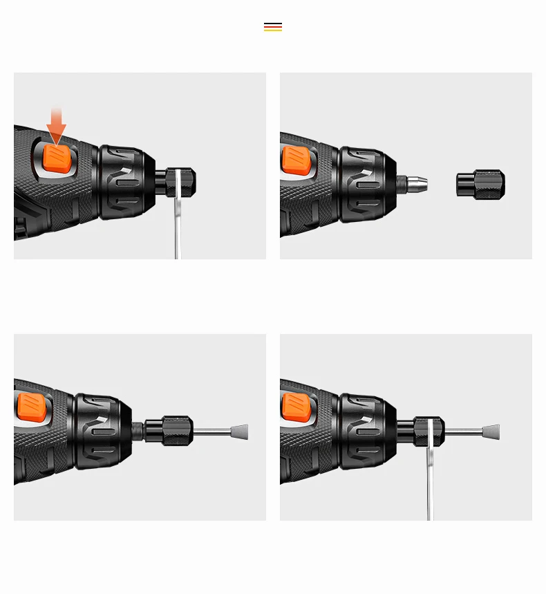 1. Удерживайте фиксатор шпинделя и используйте небольшой гаечный ключ, чтобы открутить гайку патрона; 2. Поместите соответствующий патрон и поверните гайку патрона обратно; 3. Вставьте аксессуары, которые необходимо установить; 4. Зажмите блокировку шпинделя и затяните гайку патрона небольшим гаечным ключом.