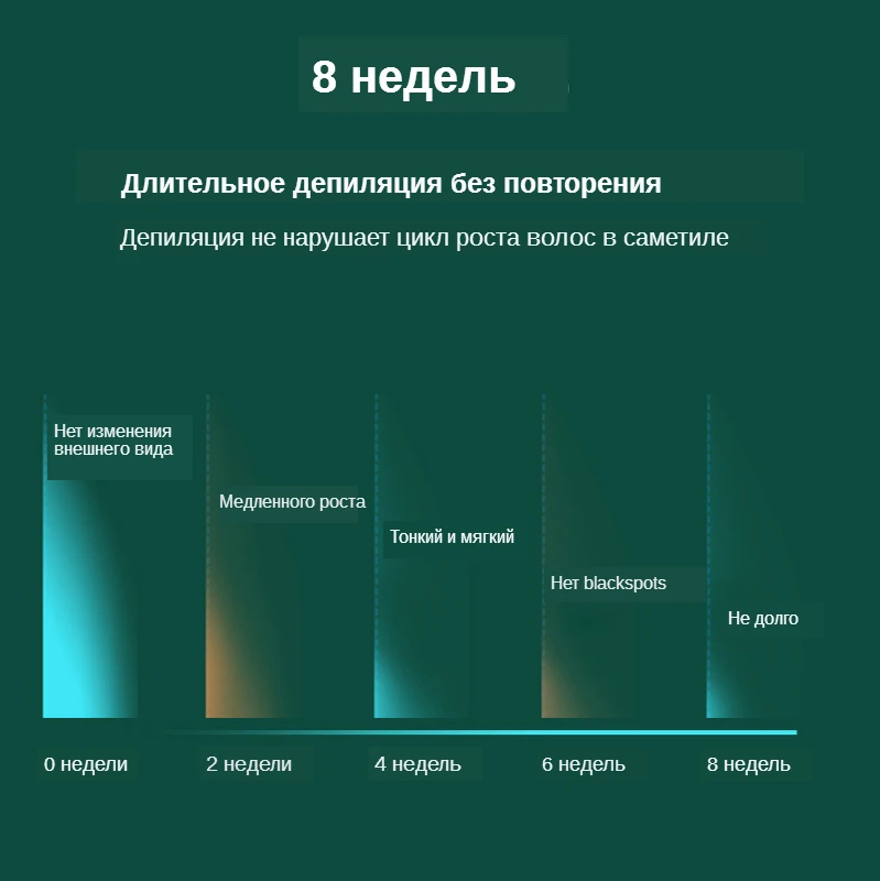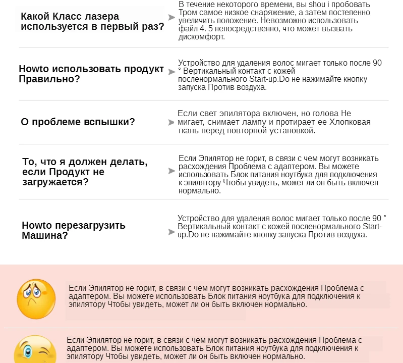 IPL подходит для вас? Устройство для удаления волос IPL подходит для кожи и волос от темно-черного до желтого (например, черного, коричневого, светло-коричневого, желтого). Но не подходит для светлых, серых, белых или красных, чей меланин не впитывает свет. Как использовать: Шаг 1: побрейте волосы и высушите кожу. Используйте медицинский спирт, чтобы очистить окно вспышки. Шаг 2: Подключите устройство, кнопка питания начнет мигать, которая показывает, что оно находится в режиме ожидания. (Примечание: Кнопка питания-это зеленый свет вспышки.) Шаг 3: нажмите кнопку «Выкл/Вкл» для запуска устройства, после запуска устройства нажмите «Выкл/Вкл» для регулировки уровня энергии. Устройство имеет 5 уровней энергии, от 1 до 5.(горит синий свет интенсивности) Шаг 4: Поместите окно вспышки вертикально и прочно на кожу там, где вы хотите удалить, нажмите кнопку вспышки Как часто его использовать: Цикл удаления волос используется 6-12 раз. 1. Использовать один раз в 2 недели от первого до шестого лечения. 2. Использовать один раз в 4 недели после шестого лечения. 3. Если вы обнаружите, что он приходит в новые волосы после 6-12 лечения, вы можете переключиться на лечение обслуживания. Например, каждые 2 или 3 месяца, зависит от индивидуального ритма роста волос.