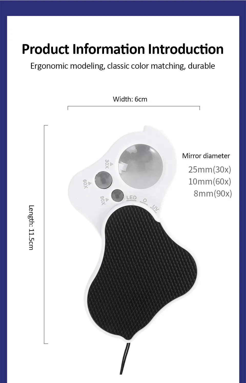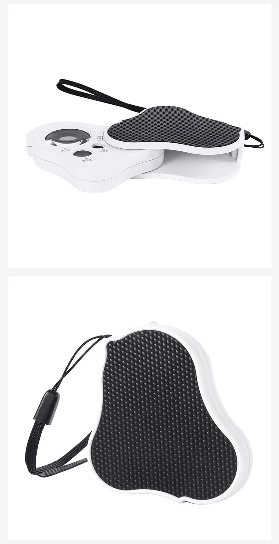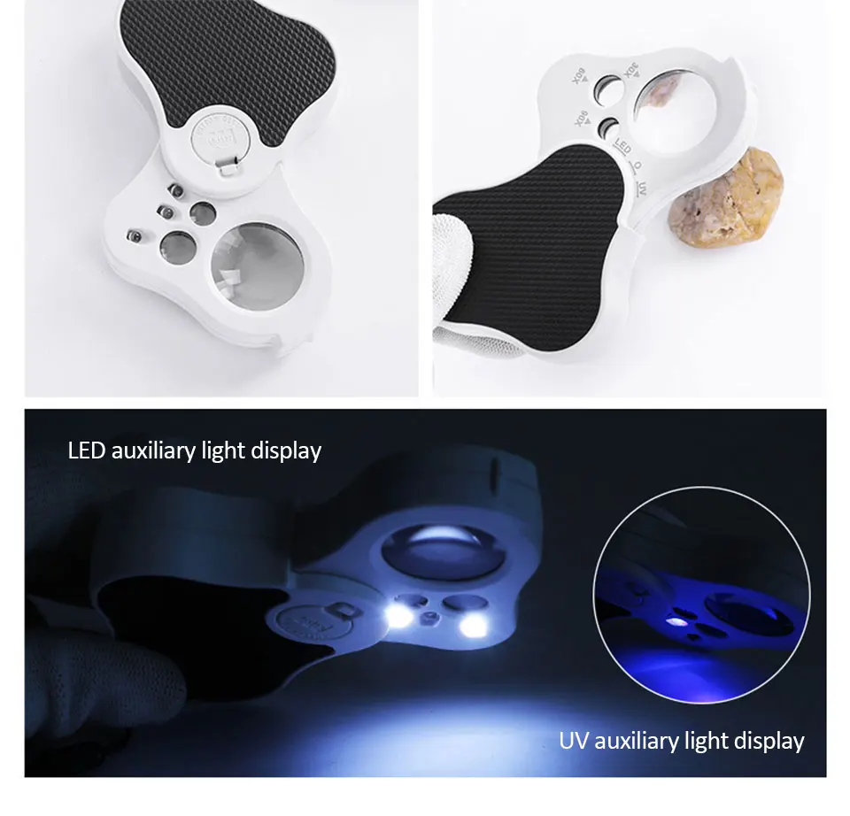 Технические характеристики: Название: Ювелирное увеличительное стекло Материал: ABS + акриловая оптическая линза Диаметр линз: 25 мм (основная линза)/10 мм (вторичная линза)/8 мм (вторичная линза) Фокусное расстояние объектива: 25 мм (основной объектив)/10 мм (дополнительный объектив)/8 мм (дополнительный объектив) Увеличение: 30x (первичное зеркало)/60x (Вторичное зеркало)/90x (Вторичное зеркало) Источник освещения: 2 * Светодиодный светильник/1 * УФ-лампа Батарея: 3 * LR1130 кнопочный аккумулятор (не входит в комплект) Размер: 70*60*20 мм (сложенный)/115*60*20 мм (расширенный) Размер упаковки: 70*65*25 мм Вес: 46 г (вес нетто)/55 г (включая упаковку) В посылка содержит: 1 * увеличительное Стекло 1 * Руководство на китайском/английском языках 1 * полипропиленовом пакете 1 * коробка