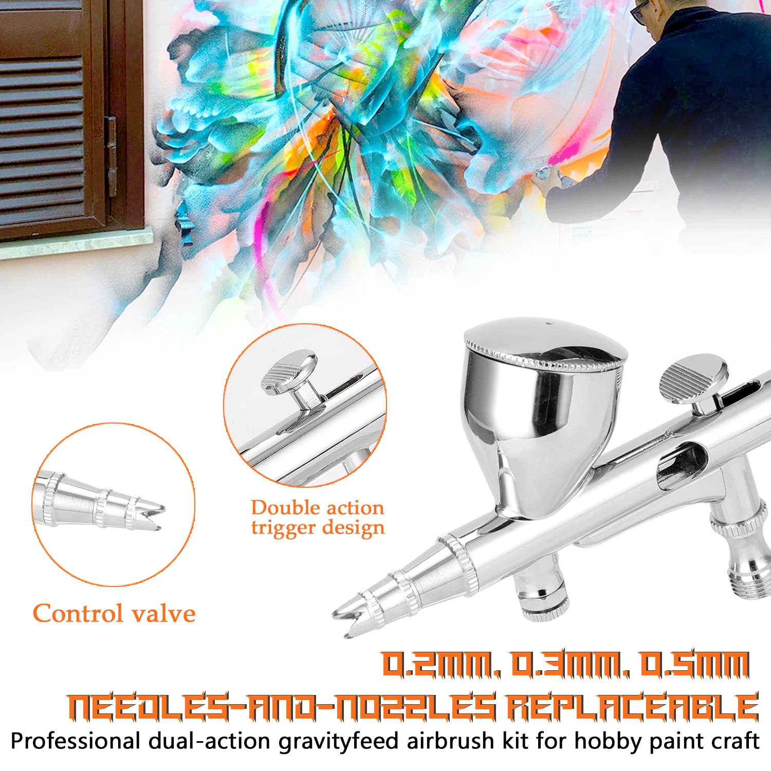 0,2 мм, 0,3 мм, 0,5 мм иглы и насадки сменные, спрей, действий триггером для легкого и точного брызг.