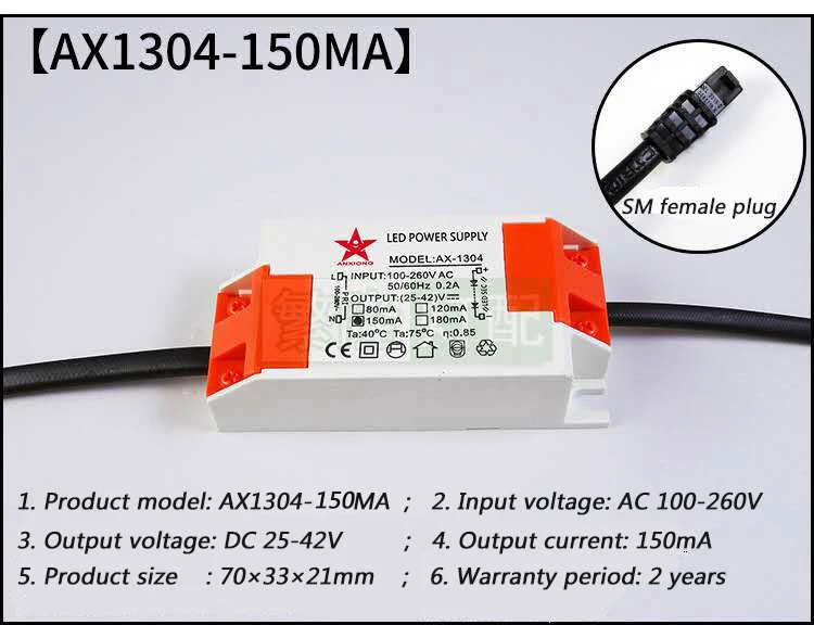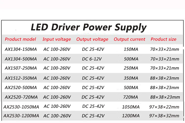Детали производства: 1. Наименование товара: Светодиодный источник питания драйвера. 2. Входное напряжение: 100-260 В переменного тока 3. Входная частота: 50-60 Гц 4. Выходной ток: 150mA/250mA/350mA/500mA/720mA/1050MA 5. Выходное напряжение: 6-12 В/25-42 В постоянного тока. 6. Гарантийный срок: два года
