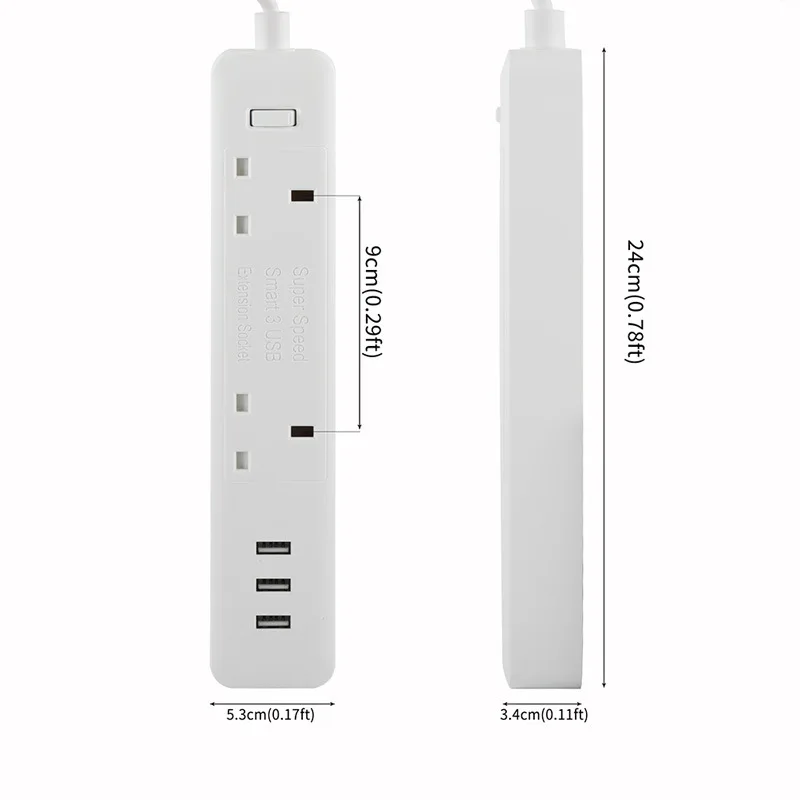 1. Тип штепсельной вилки: штепсельная вилка стандарта Великобритании 2. Номинальное напряжение: 110-240 В 3. Номинальный ток: 10A (макс.) 4. Номинальная мощность: 2500 Вт 5. Частота переменного тока: 50-60 Гц 6. Socket_Outlets: 2 выхода 7. USB Порты и разъёмы: 3 Порты USB Порты и разъёмы s (5V-2.1A/3.1A макс) 15,5 W 8. Шнур Длина: 1,8 метр 9. Размер: 242*60*36 мм