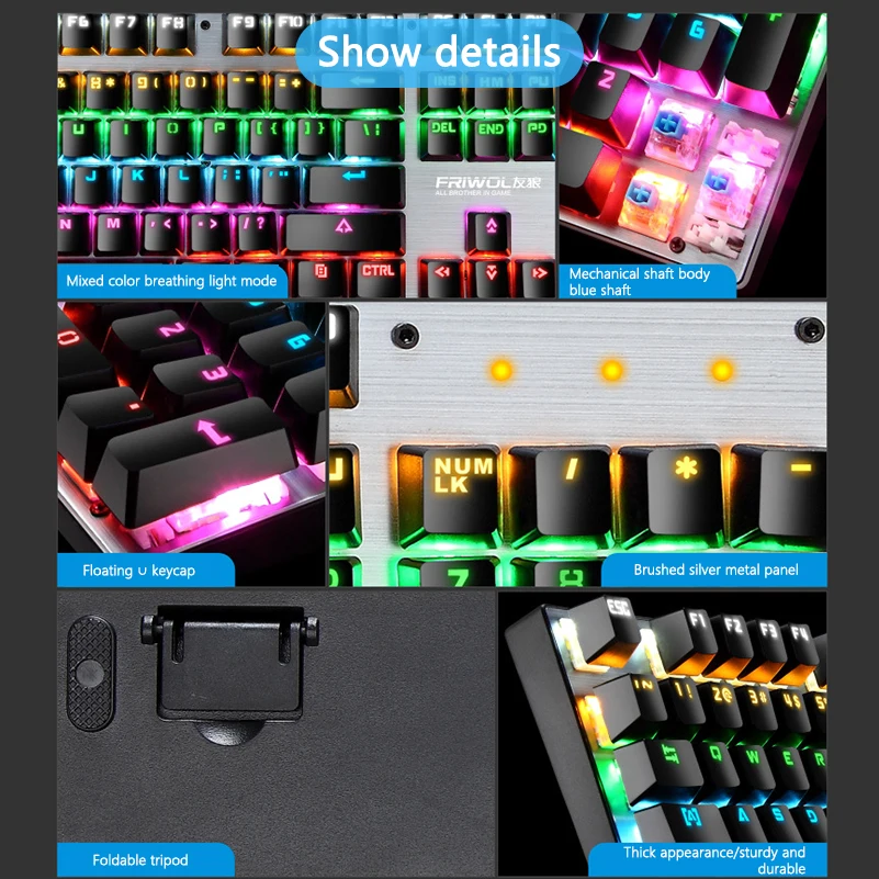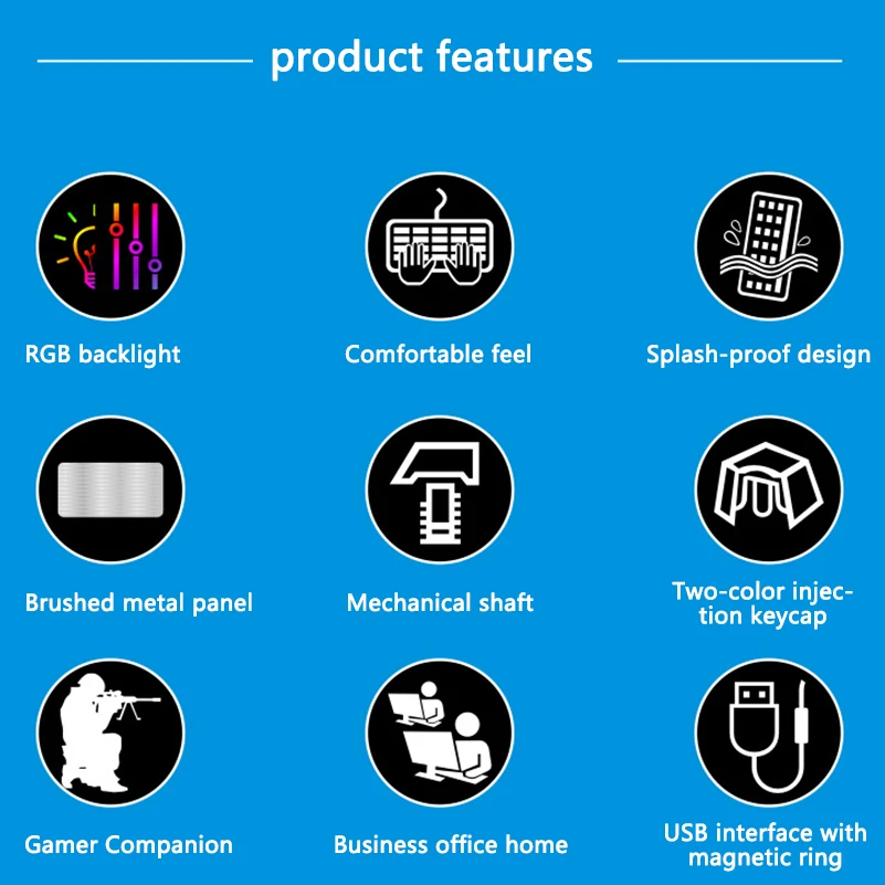 Selling points: --Plug and play, do not need to install any driver, easy to use. --Humanized design, adding a series of shortcut function keys. --Ergonomics design is made for gamer, officer, etc. --Supports RGB Color backlighting --Adopting professional game chip, giving you a perfect game experience