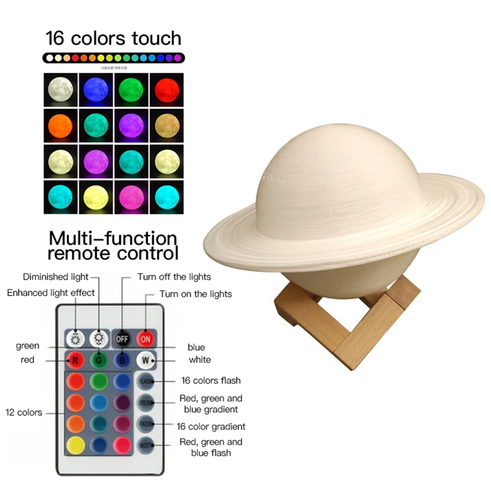 Saturn 3D Printing Night Light Bedside Lamp with Stand & Remote & Touch Control & USB Rechargeable for Kids Women Girls Family Birthday Christmas Gift