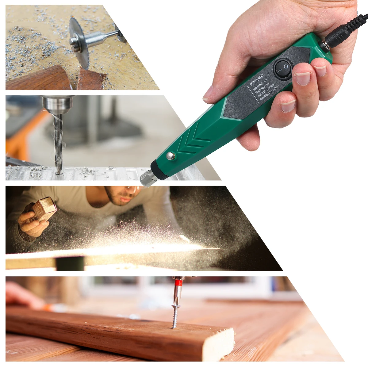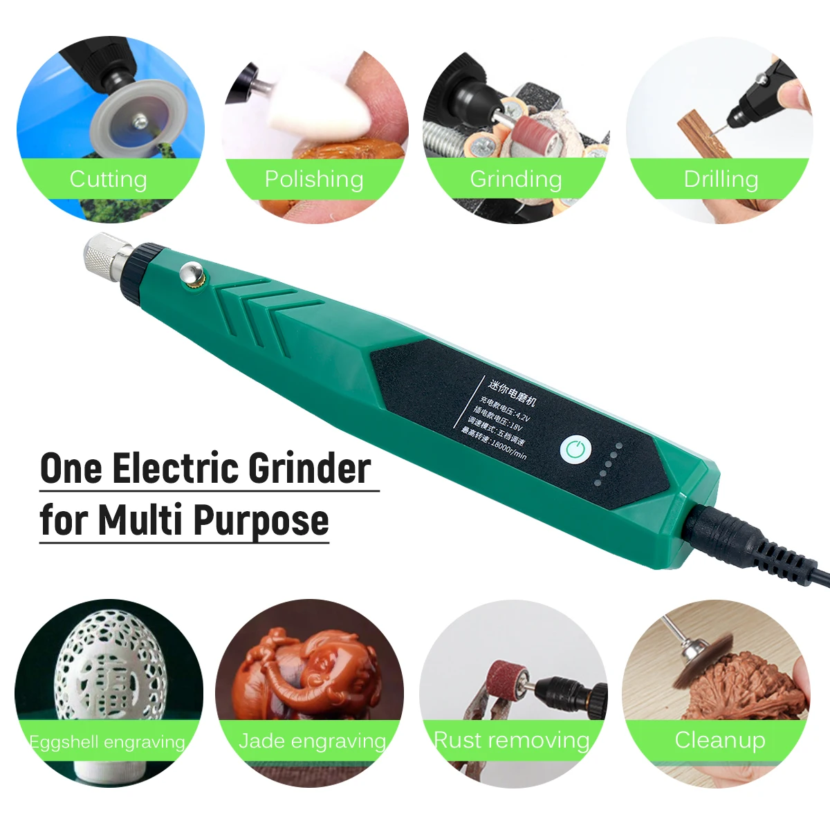 Этот многофункциональный набор инструментов для электрической шлифовки отличается практичностью, высокой эффективностью, высококачественным материалом и длительным сроком службы, имеет различные аксессуары. Он используется для резьбы, полировки, резки и полировки нескольких материалов, таких как дерево, пластик, металл, нефрит и т. д.