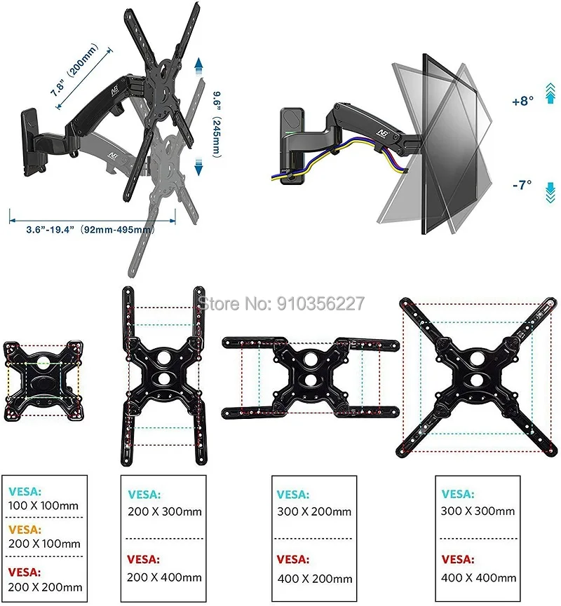 1. Название продукта: полностью подвижное газовое крепление для телевизора 2. Модель: F450 3. Загрузка: 8-16 кг или 17,6-32,5lbs 4. Размер VESA: 100*100 мм/200*100 мм/200*200 мм/300*200 мм/300*300 мм/400*200 мм/400*300 мм/400*300 мм/400*400 мм 5. Размер телевизора: 40 "-50" 6. Материалы: высококачественный железо и АБС и т. Д.