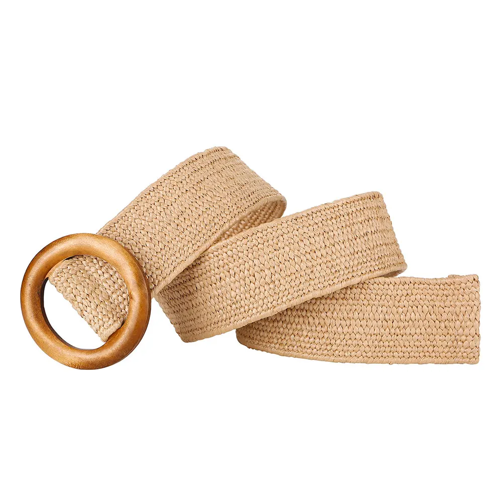 Плетеный пояс с круглой деревянной пряжкой придает винтажный вид.