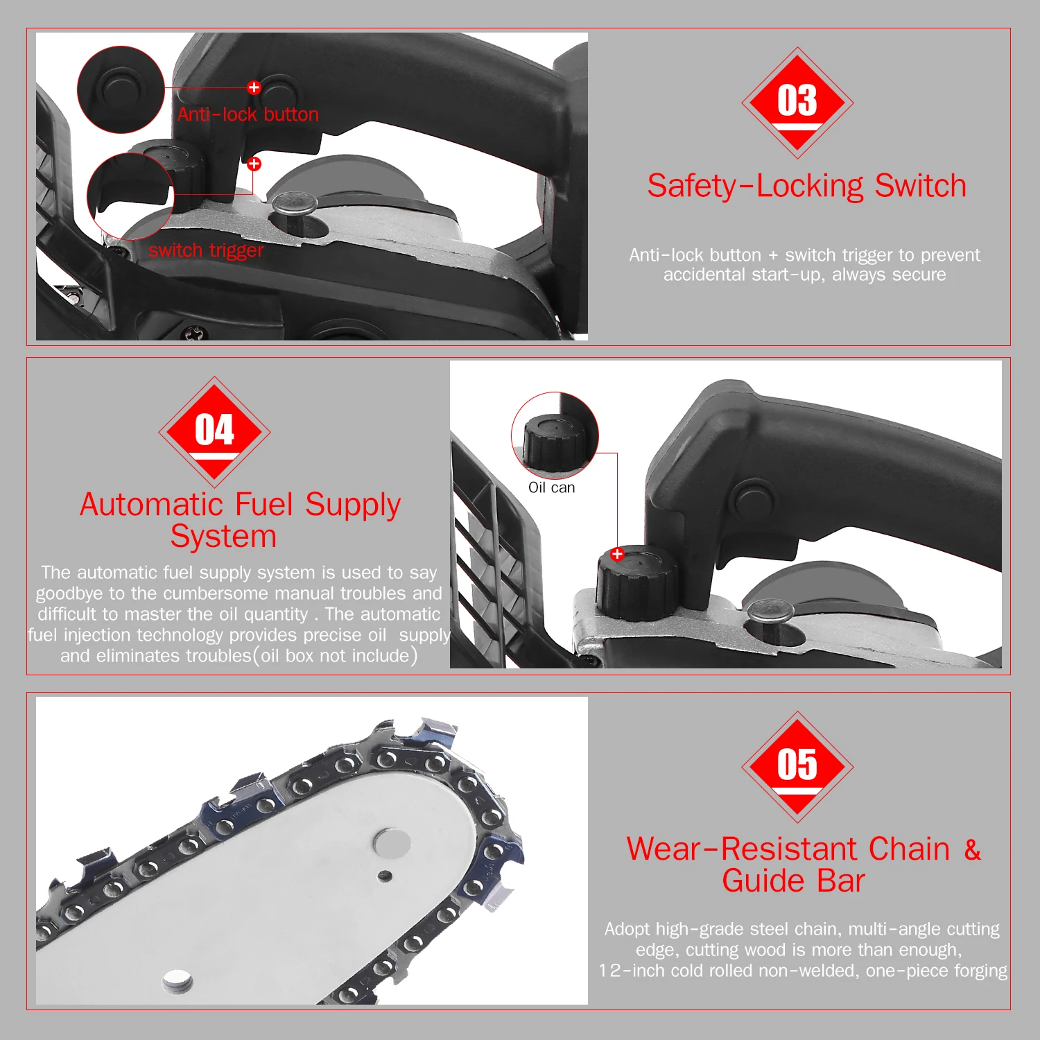 Автоматическая смазка цепи-автоматическая система смазки цепи масла в бар и цепь, когда это необходимо для обеспечения долговечности и оптимального использования не только делает для более плавных, более эффективных разрезов, это продлевает срок службы инструмента. И с индикатором уровня масла для четкого просмотра.