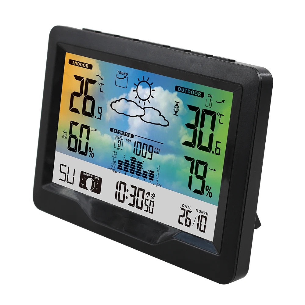 Универсальная Погодная станция-Используйте большой цветной ЖК-экран для отображения дополнительной информации, которая вам необходима: домашняя/наружная температура и влажность (макс./мин), настройка температуры и влажности (hi/lo) оповещения, время/дата/неделя, двойной будильник/Повтор (Экстра 5-минутный сон), яркий прогноз погоды, фазы Луны, барометрическое давление и уровень комфорта.
