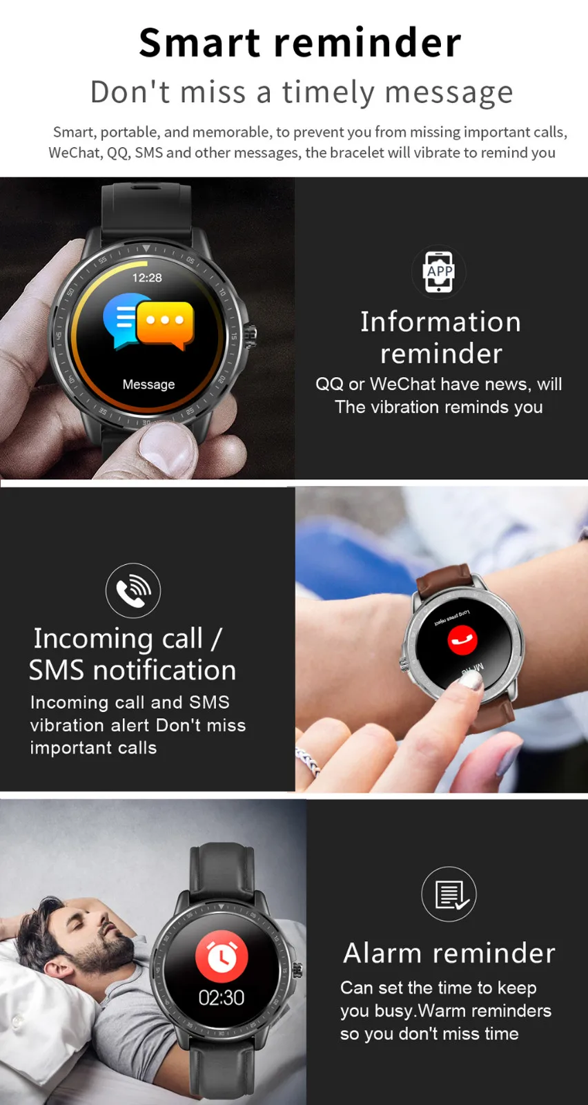 Напоминание о звонке, напоминание о информации, запись упражнений (подсчет шагов, пробег,