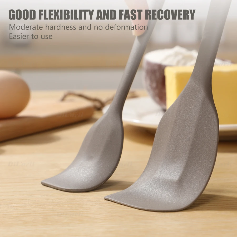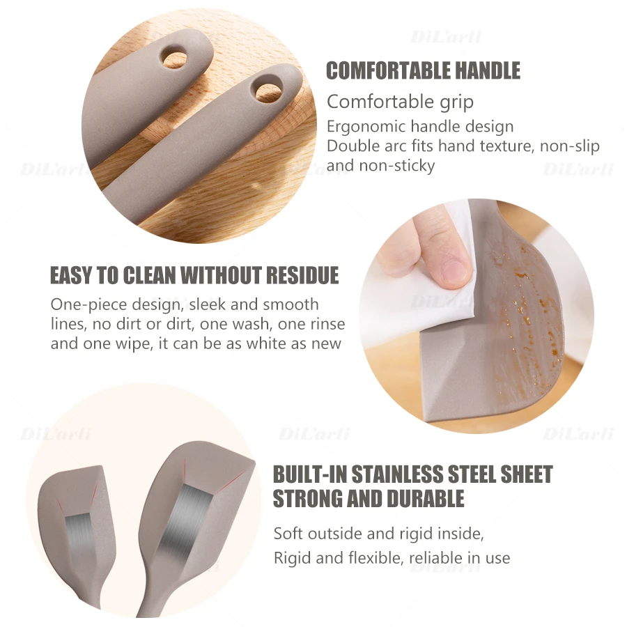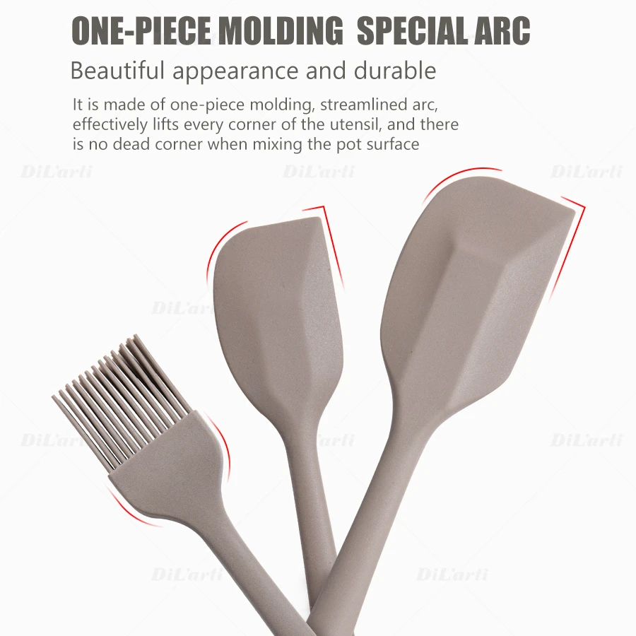 Характеристики: Цельный силиконовый инструмент для выпечки, пищевой силиконовый материал, безопасный и нетоксичный, высокотемпературный, специально разработанный для кухни. Цельное формование, безопасный контакт, защита от загрязнения и грязи, высокотемпературная стерилизация; Хорошая эластичность, быстрое восстановление, умеренная твердость и отсутствие деформации. Скребок имеет красивый и прочный внешний вид и не меняет цвет. Он изготовлен из цельного формования, с обтекаемой дугой, которая эффективно поднимает каждый уголок посуды, и нет мертвых углов при смешивании поверхности горшка.