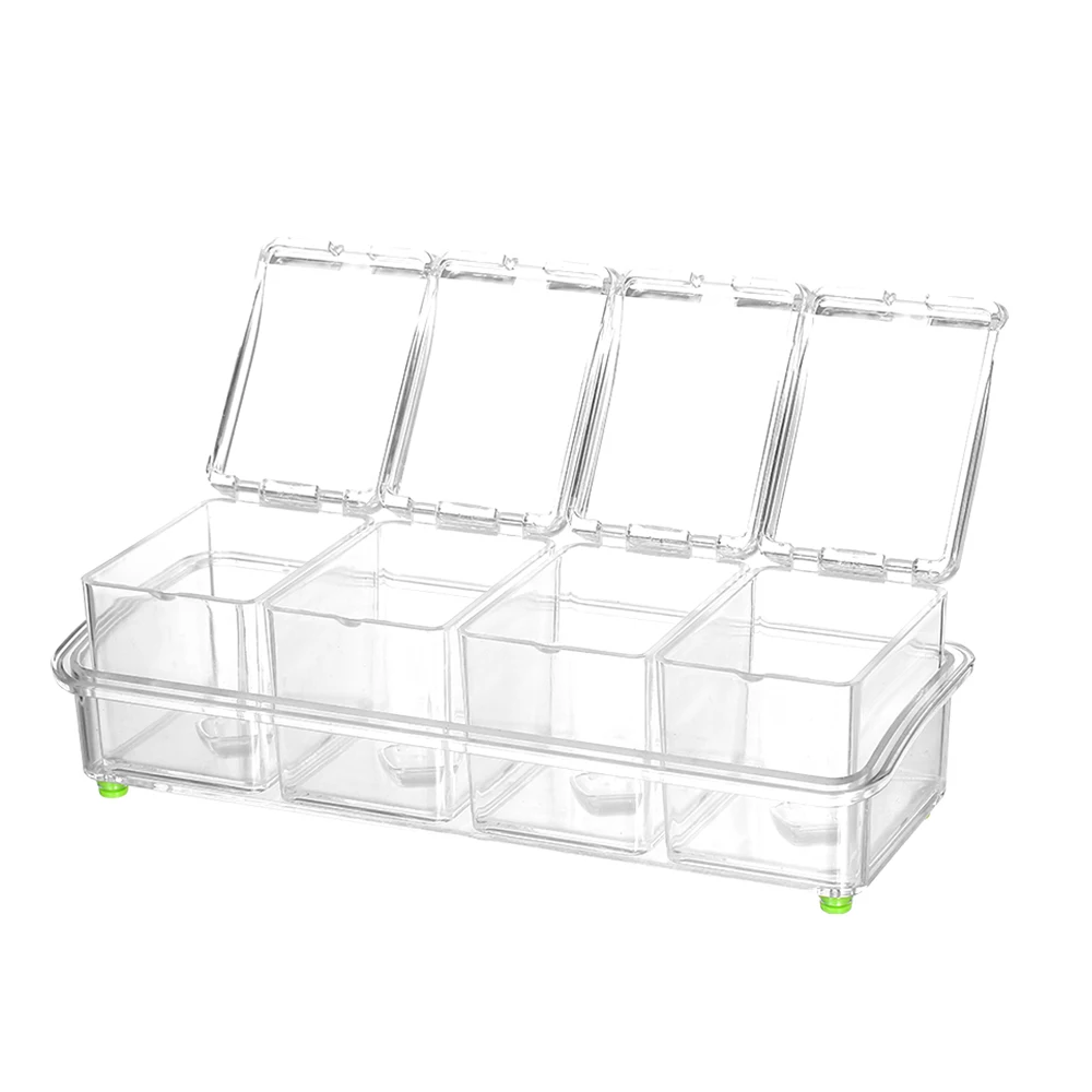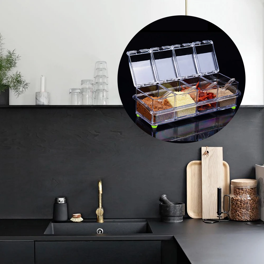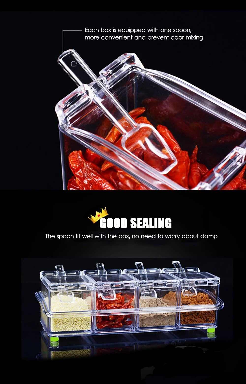 Этот набор коробок для приправ изготовлен из прозрачного пластика, поэтому вы всегда можете легко получить нужную пряность. В стойке 4 съемных ящика, каждая из которых оснащена ложкой, легко моется и удобна в использовании. Это такой практичный кухонный продукт, чтобы сохранить вашу пряность свежей, без запаха и вдали от пыли и жуков.