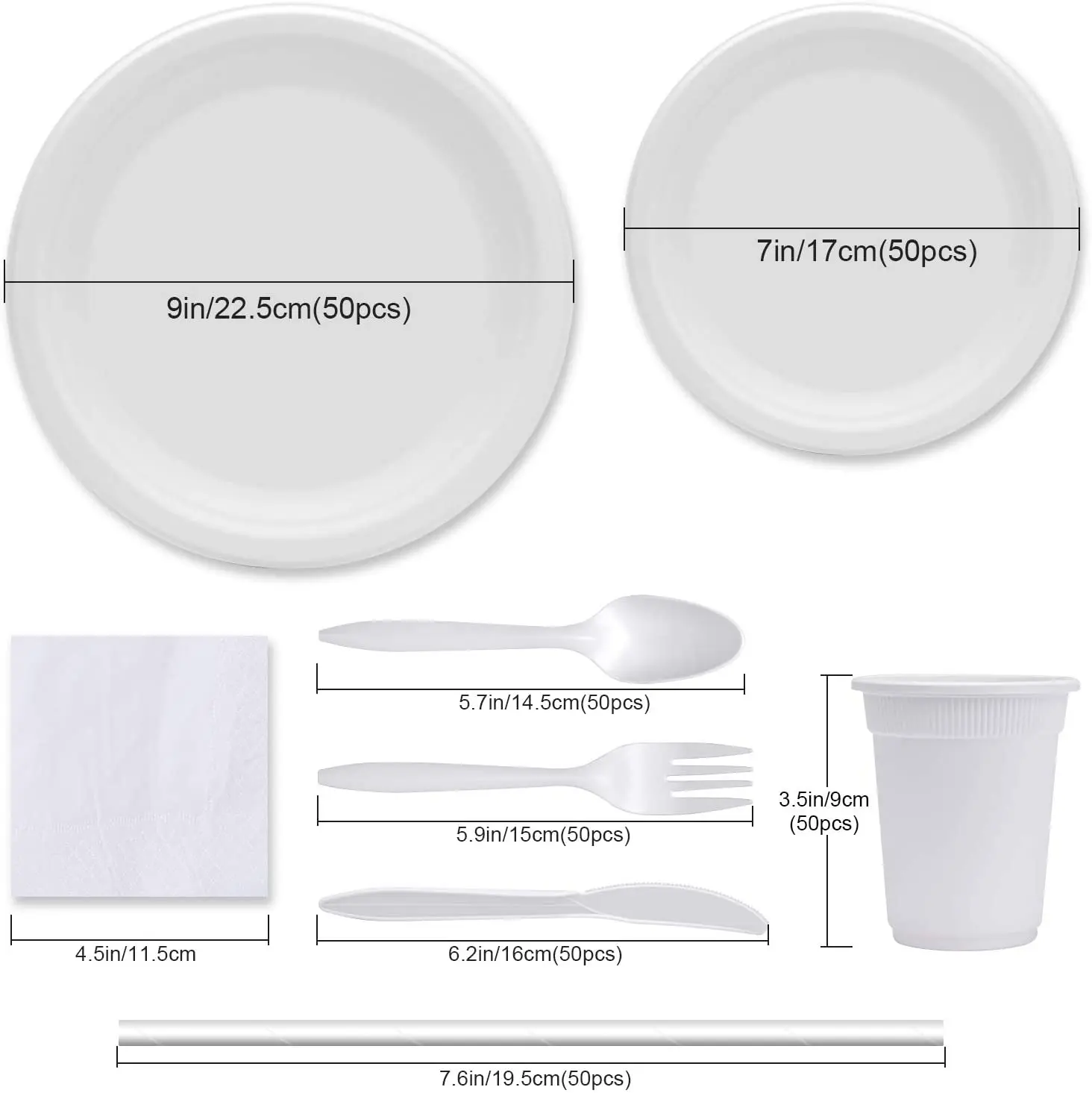 Тарелки 50 шт 9 ", Тарелки 50 шт 7 ", Салфетки 50 шт, Ножи 50 шт, Вилки 50 шт, Ложка 50 шт, Чашки 50 шт, Соломинки 50 шт.