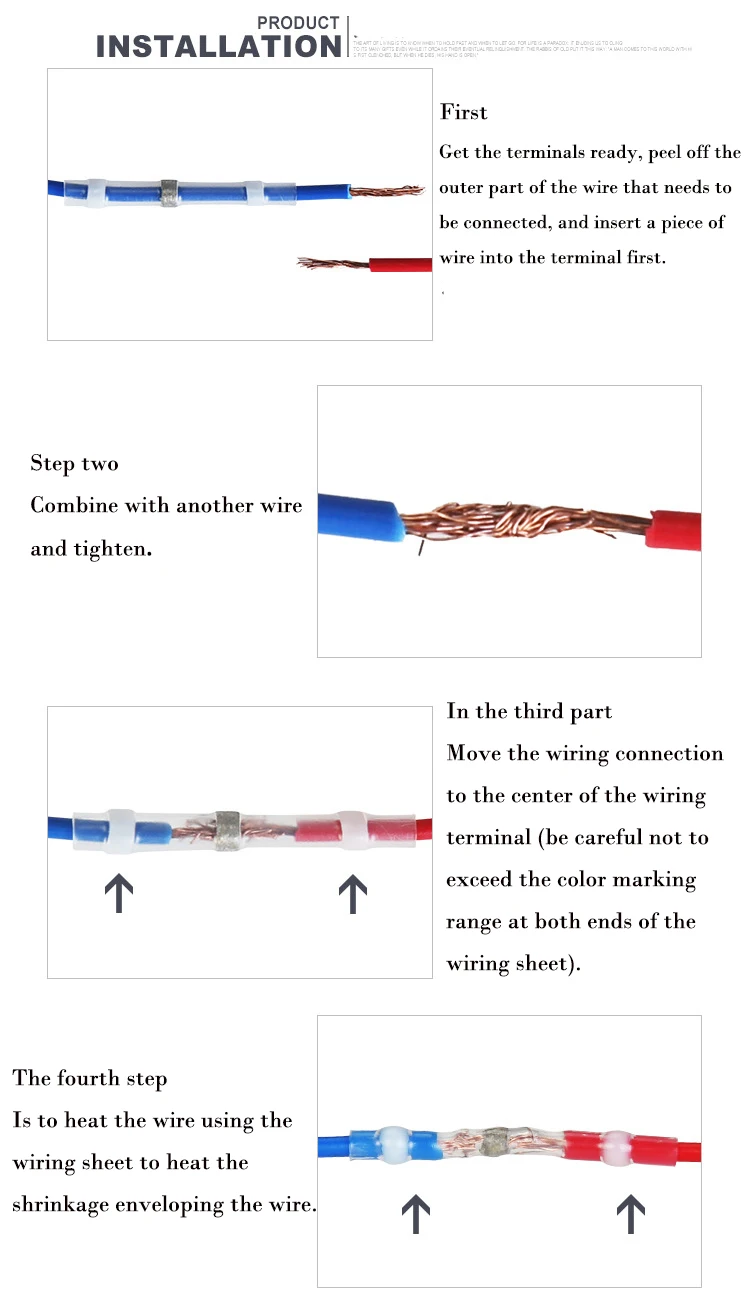Особенности: • Коэффициент усадки 2:1 ● Легкие одношаговые Проводные соединения. ● Простая Идентификация: цветная соединительная трубка. ● Полиолефиновые термоусадочные стыковые разъемы улучшают прочность на изгиб. ● Высококачественные провода разъемы в уплотнение, сброс напряжения, проверка кабеля и изоляция. ● Плавленный припой обеспечивает прочное соединение проводов и позволяет избежать выскальзывания проводов из терминала.