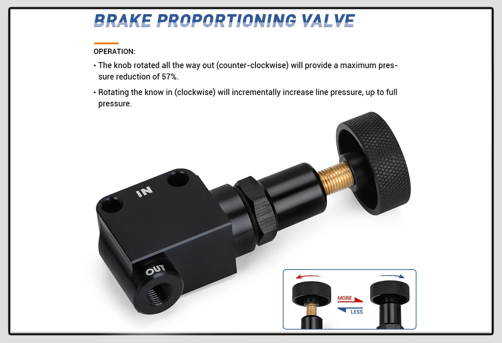 Компактная и легкая кованая алюминиевая конструкция из заготовки сделала пропорциональные клапаны лучшими доступными.Регулировка давления колеблется в диапазоне от 100 до 1000 фунтов на кв. дюйм и обеспечивает максимальное снижение давления в линии на 57%.Эта Регулировка позволяет вам точно настроить баланс переднего и заднего торможения, пропорционально снизив давление на заднюю тормозную магистраль. При переходе на задние дисковые тормоза или большие передние тормоза обычно требуется пропорциональный клапан. Размеры и материал:Изготовлен из высококачественного алюминия. Цвет: черный.Посылка