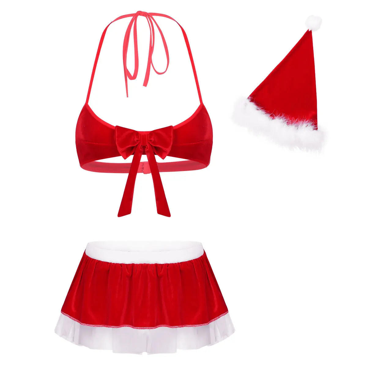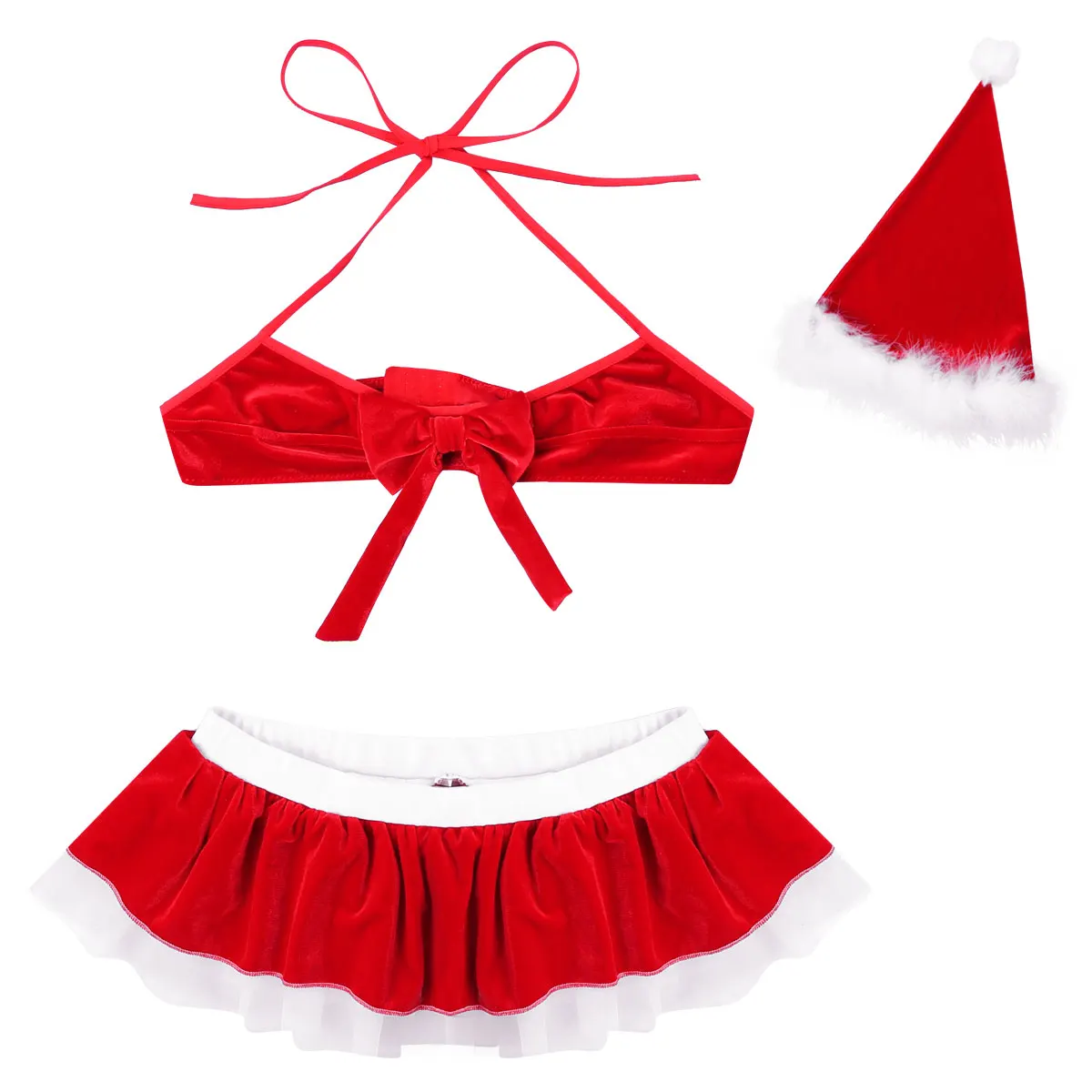 Комплект включает в себя: 1 Топ с бюстгальтером, 1 юбка, 1 рождественская шляпа