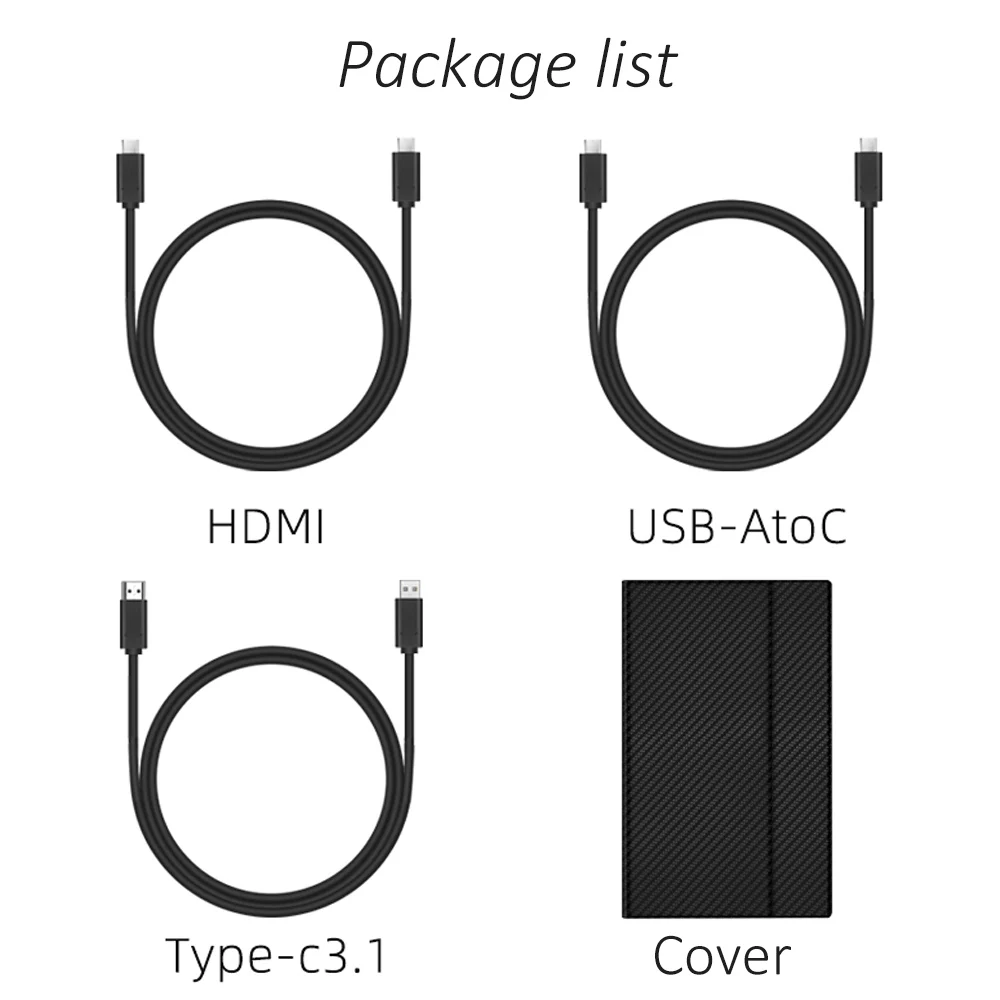 Посылка список1 *15,6 inch 1080p экран 1 * кабель Type-c1 * USB кабель 1 * HDMI кабель 1 * зарядное устройство (вилка американского стандарта)Пожалуйста, оставьте сообщение, если вам нужен другой стандарт