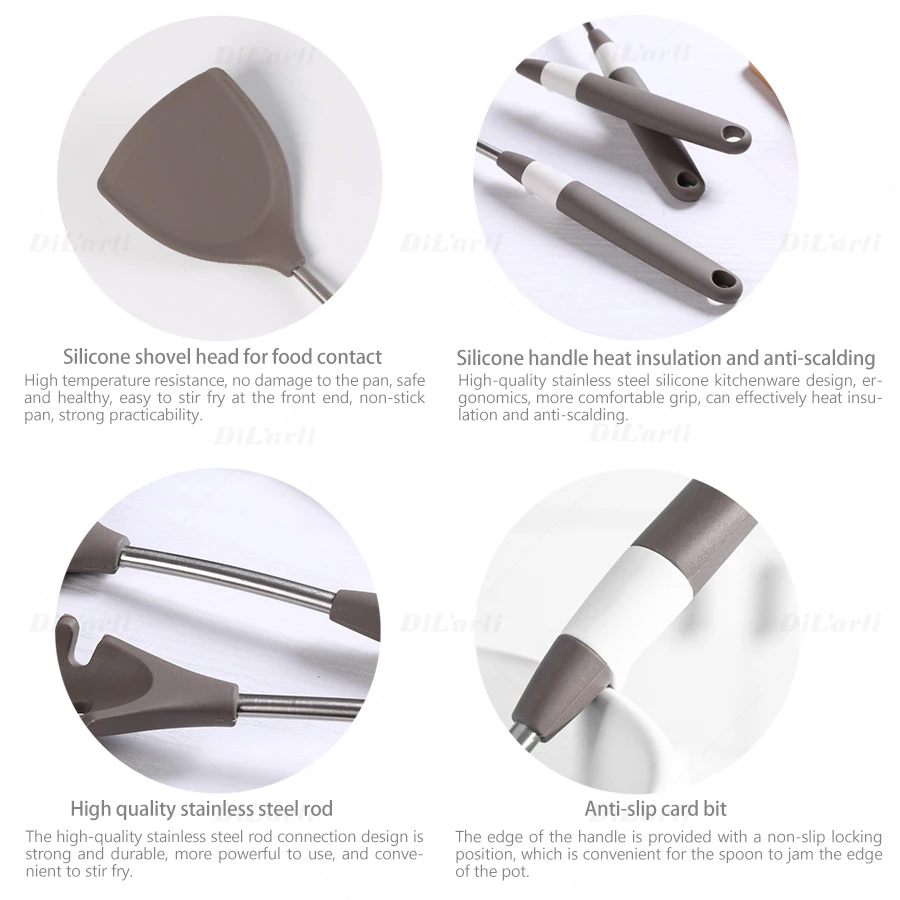 2. Высокая термостойкость, отсутствие повреждений сковороды, безопасная и здоровая, легко размешать жарку на переднем конце, антипригарная сковорода, сильная практичность. Высококачественная конструкция соединения стержня из нержавеющей стали, прочная и долговечная, более мощная в использовании, легко размешать жарку. Нескользящее зажимное положение, эргономика, противоскользящее зажимное положение устанавливается на кромке ручки, ручка более удобная, красивая и практичная, И это удобно для совок, чтобы заварить край червя и легко мыть.