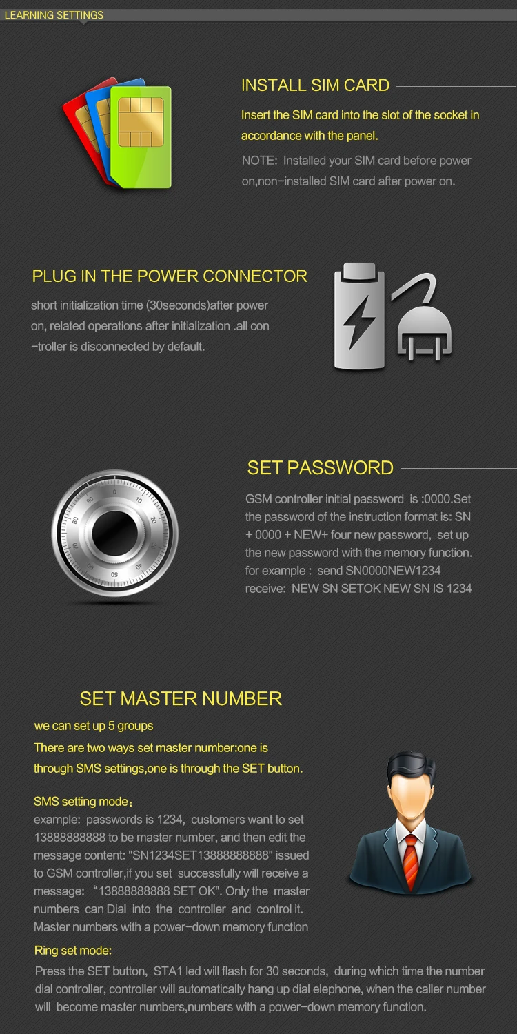 1. С защитой паролем 2. Можно настроить 5 групп основных номеров управления 3. SMS-управление (вкл/выкл/COM/T/L/XT/команда проверки) 4. Бесплатный звонок для управления Пользователь может управлять GSM-контроллером, набирая номер SIM-карты контроллера GSM. Пользователь может услышать «вы не можете ответить на телефонный звонок, звуковой сигнал, звуковой сигнал ....... тон и т. Д.», что означает изменение состояния реле успешно. Если контроллер подключен, он перейдет в состояние отключения после вызова. Если исходное состояние отключено, после вызова изменится состояние подключения. 5. Кнопка управления Состояние контроллера будет изменено, когда вы нажмете кнопку SW сбоку контроллера. Если контроллер подключен, он изменится на состояние отключения. Если исходное состояние отключено, оно изменится на состояние подключения. 6. Пользователь может отправить sms для проверки состояния ВКЛ/ВЫКЛ. SMS-текст: SN + пароль + проверка 7. С функцией памяти при отключении питания 8. Бытовая электрическая техника с дистанционным управлением по вызову sms, высокомощный двигатель переменного тока, генератор, удаленная базовая станция, распределительная панель PBX, водяной насос, маршрутизатор, сервер и т. д.